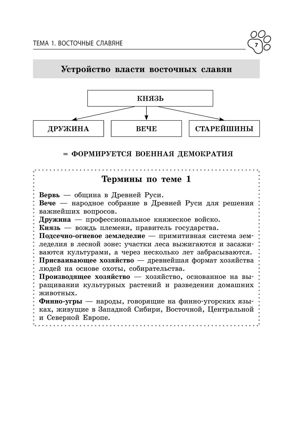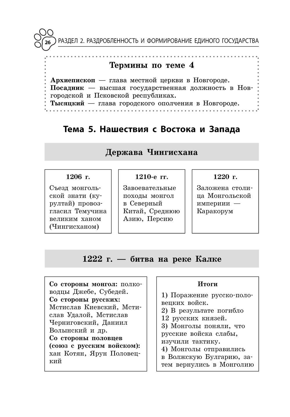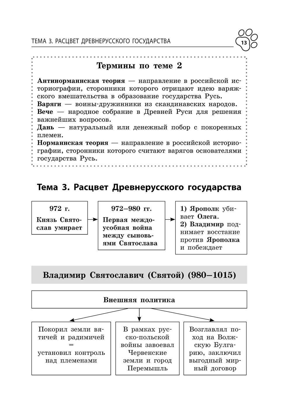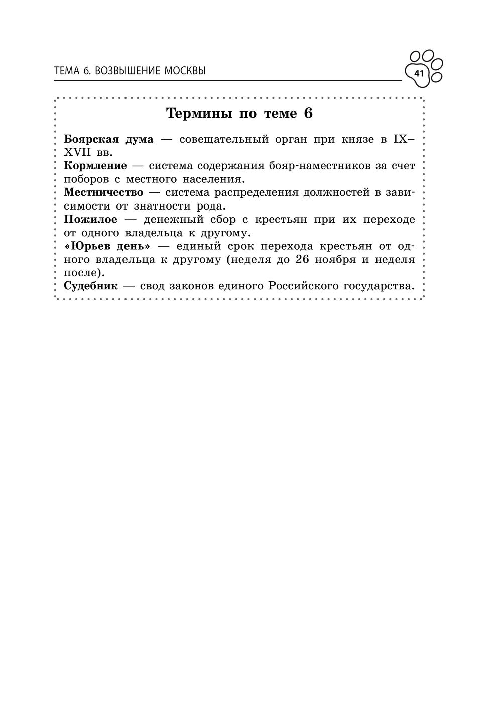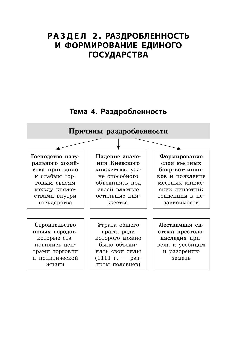 Приводятся сведения по историческим периодам: "Русь в IX-XII вв.", "Раздробленность и формирование единого государства", "Российское царство", "Начало империи. XIII в.", "Российская империя в XIX в.", "Первая половина XX в.", "Послевоенное развитие СССР", "Новая Россия". В конце каждой темы расположены списки необходимых терминов.