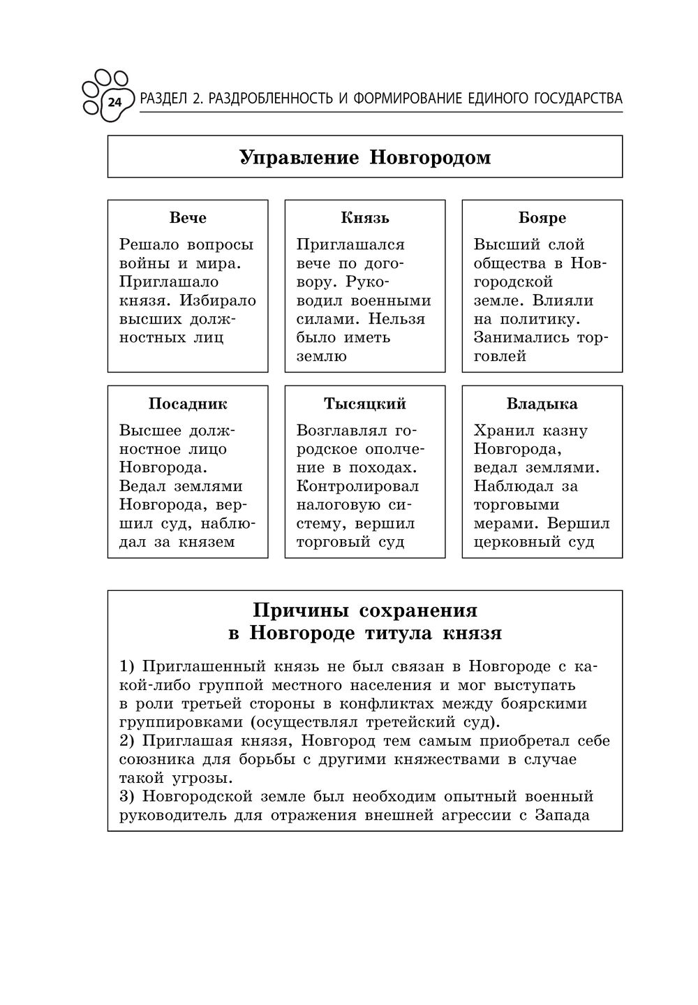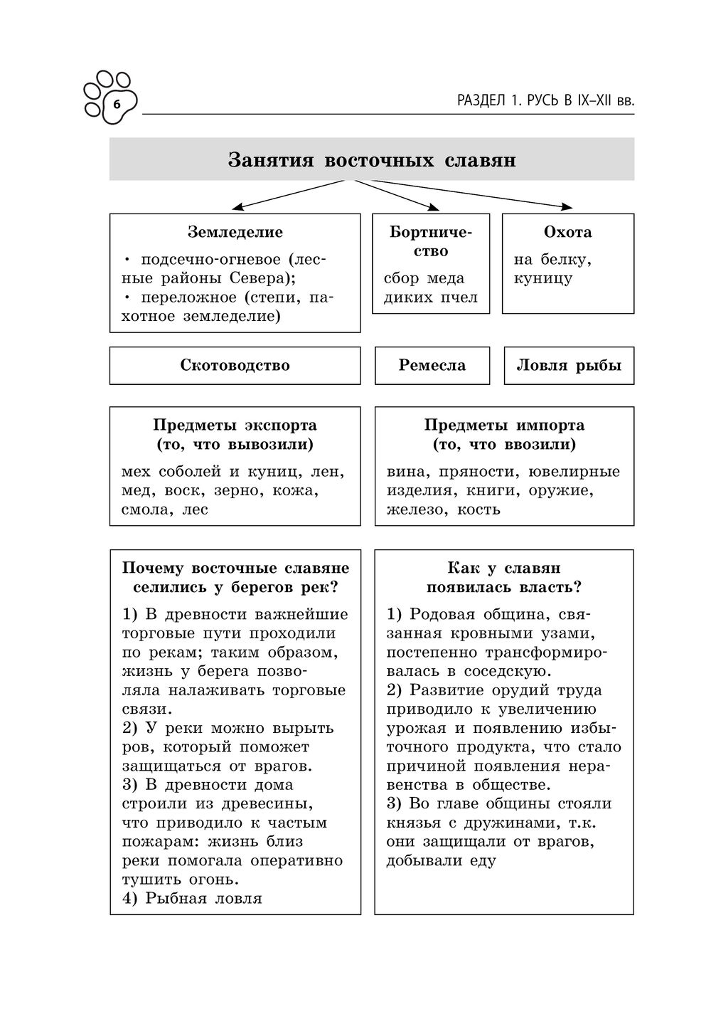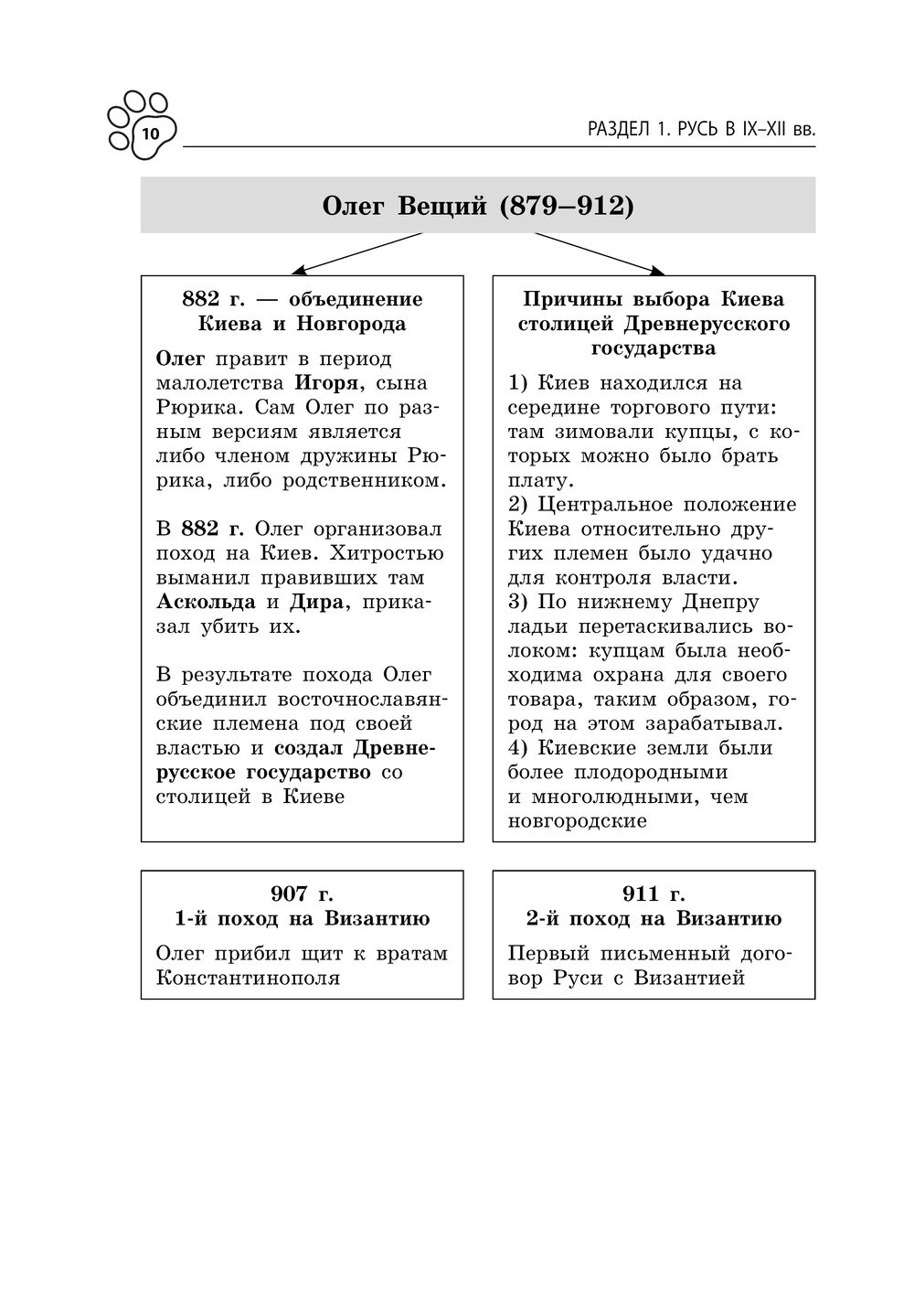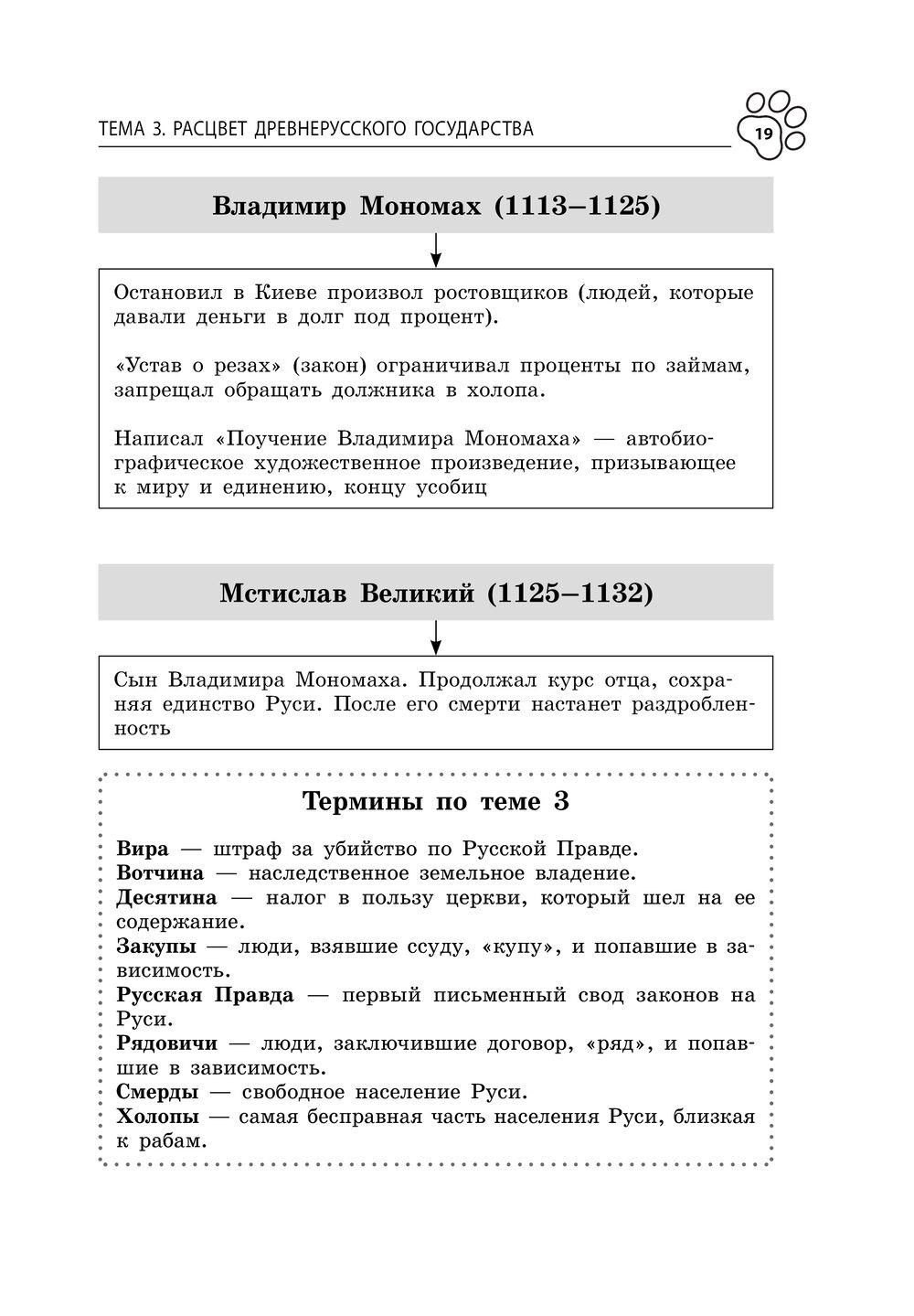 Приводятся сведения по историческим периодам: "Русь в IX-XII вв.", "Раздробленность и формирование единого государства", "Российское царство", "Начало империи. XIII в.", "Российская империя в XIX в.", "Первая половина XX в.", "Послевоенное развитие СССР", "Новая Россия". В конце каждой темы расположены списки необходимых терминов.