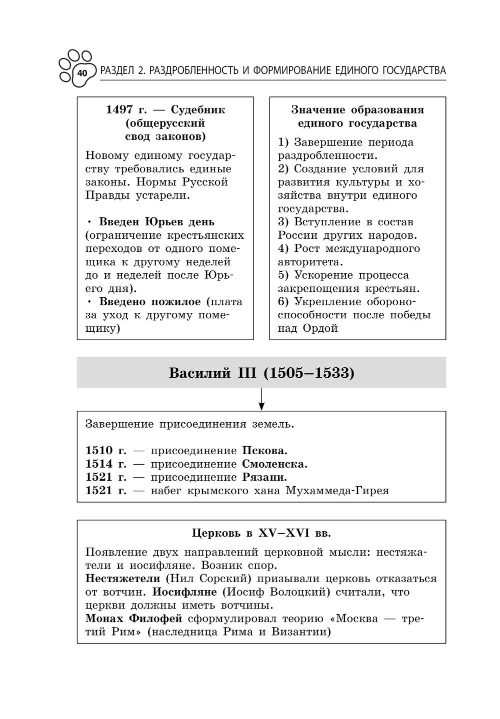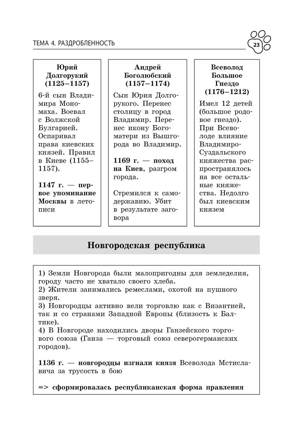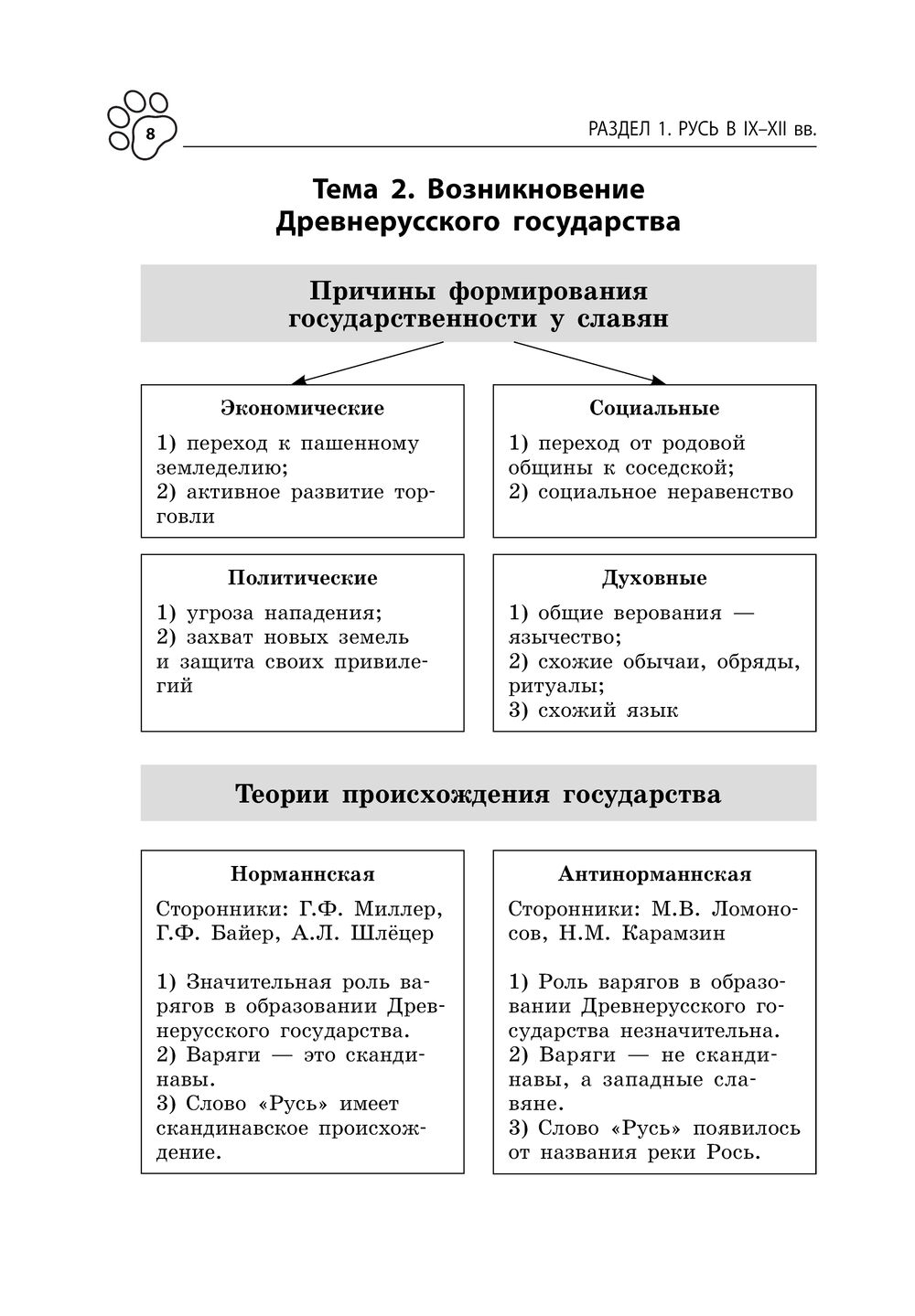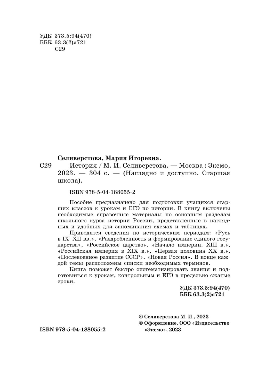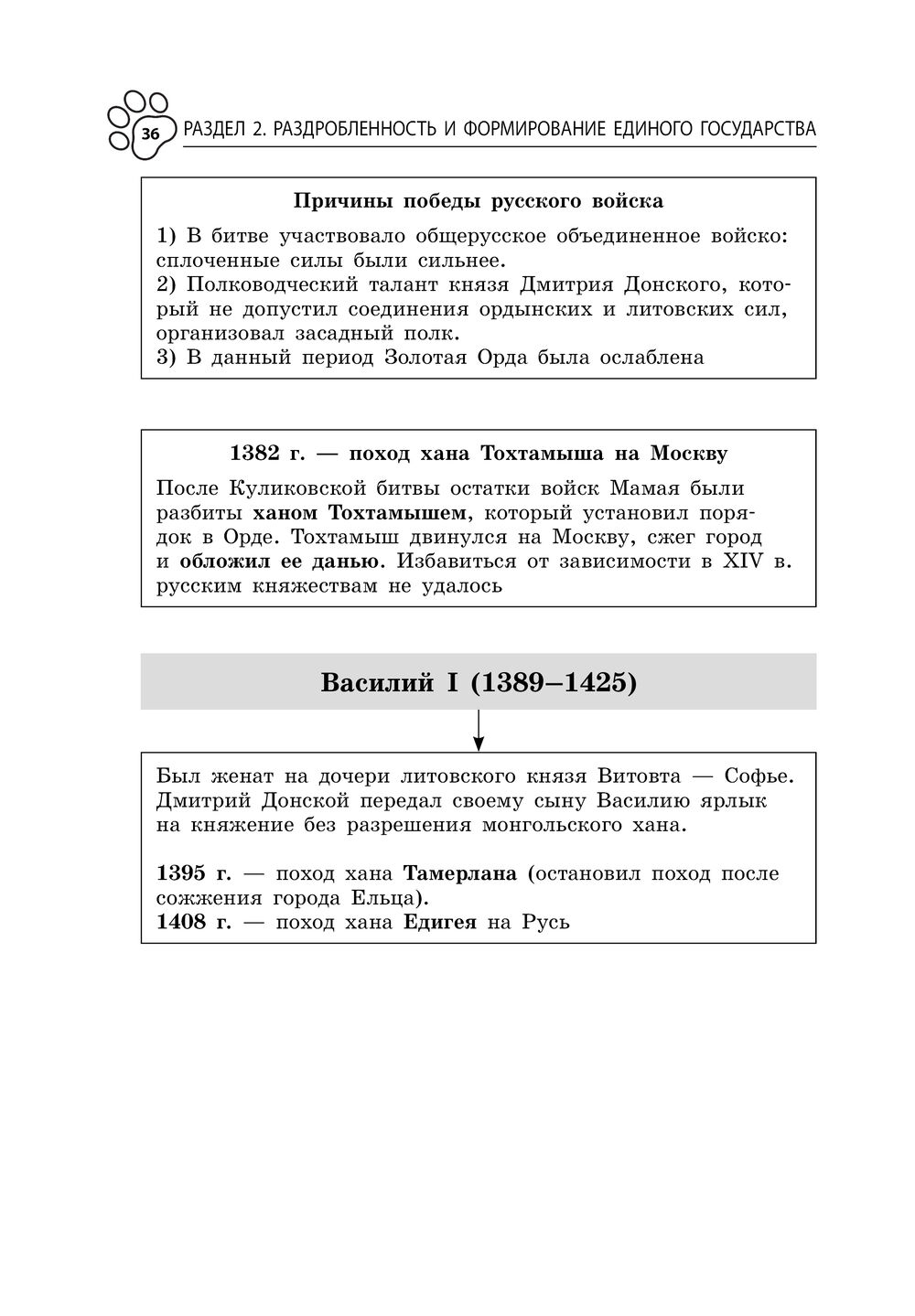 Приводятся сведения по историческим периодам: "Русь в IX-XII вв.", "Раздробленность и формирование единого государства", "Российское царство", "Начало империи. XIII в.", "Российская империя в XIX в.", "Первая половина XX в.", "Послевоенное развитие СССР", "Новая Россия". В конце каждой темы расположены списки необходимых терминов.