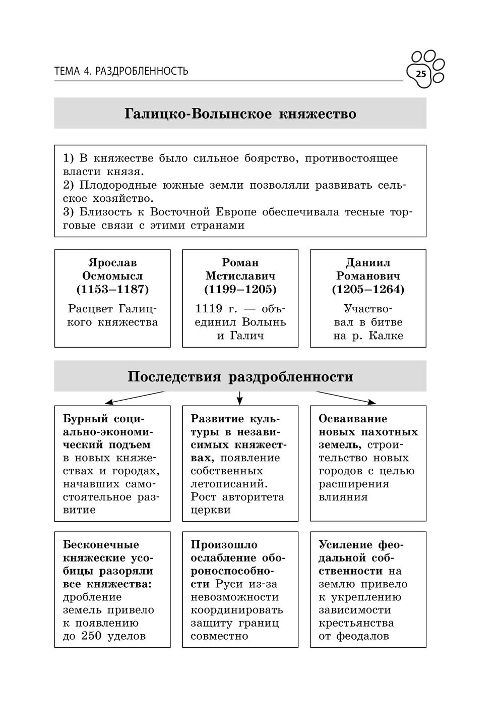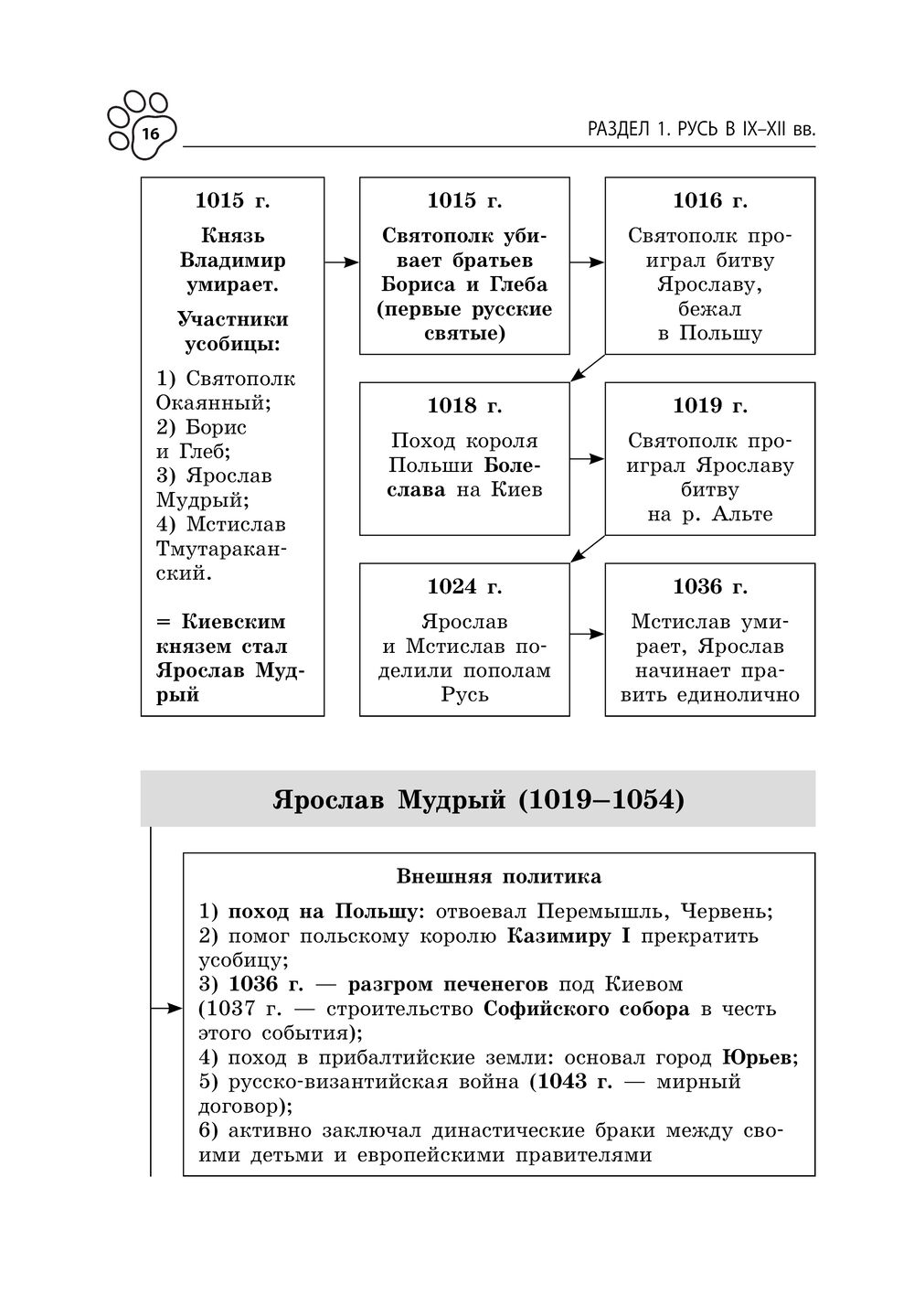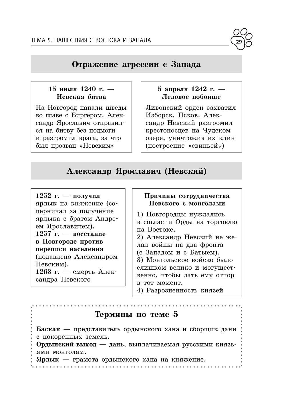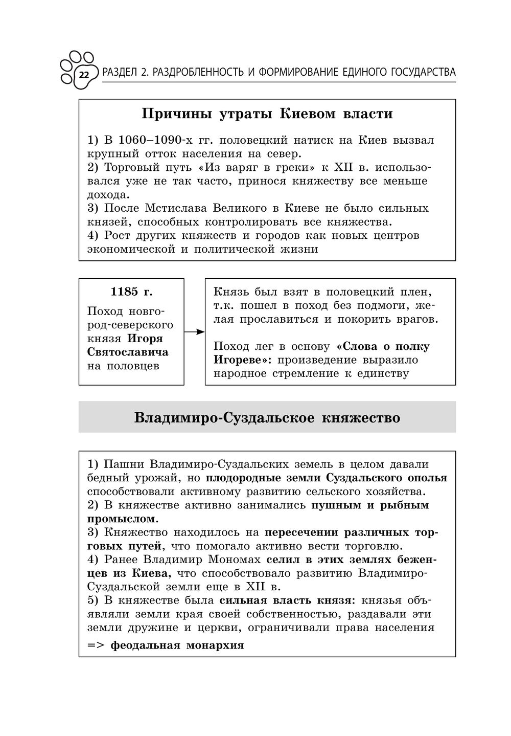 Приводятся сведения по историческим периодам: "Русь в IX-XII вв.", "Раздробленность и формирование единого государства", "Российское царство", "Начало империи. XIII в.", "Российская империя в XIX в.", "Первая половина XX в.", "Послевоенное развитие СССР", "Новая Россия". В конце каждой темы расположены списки необходимых терминов.