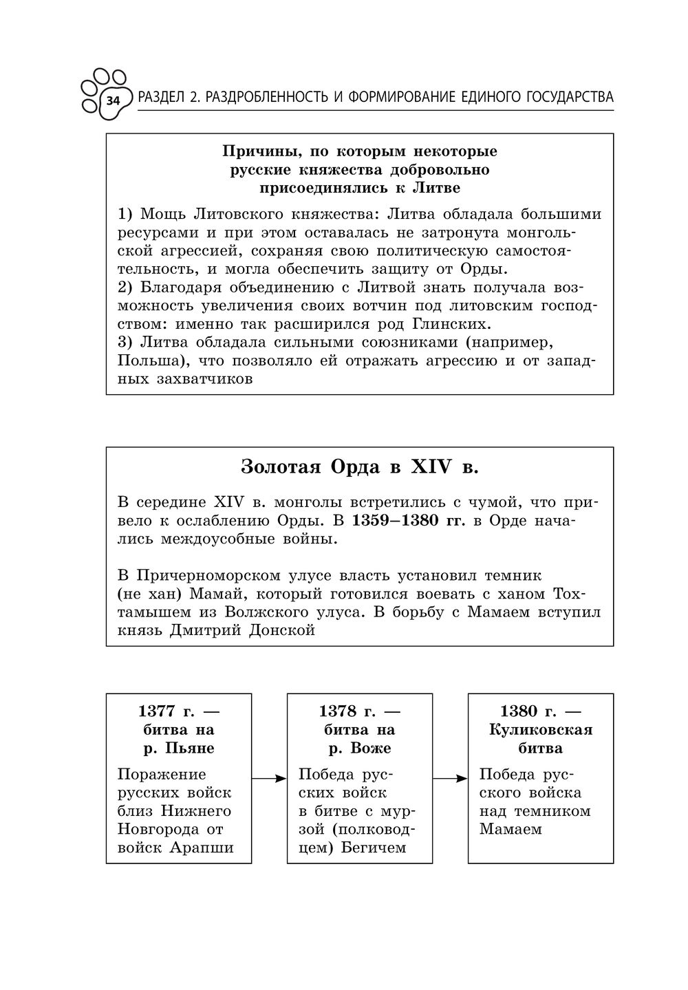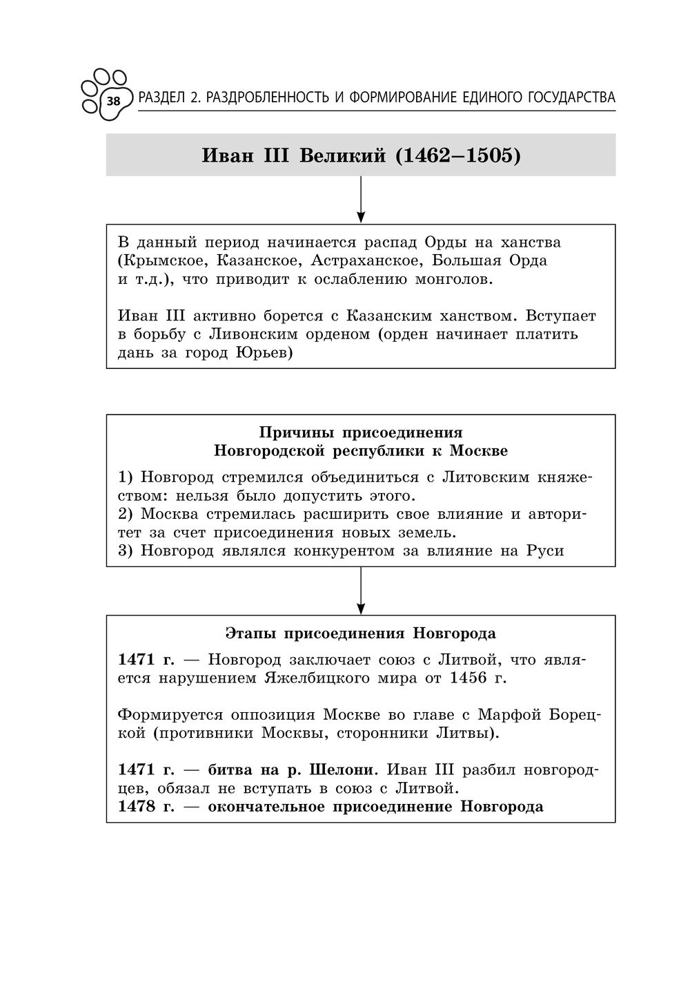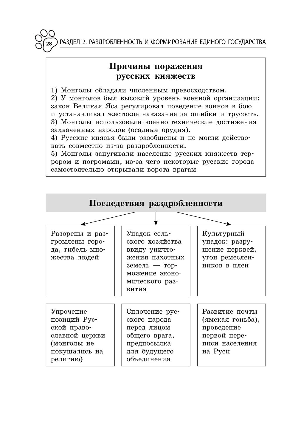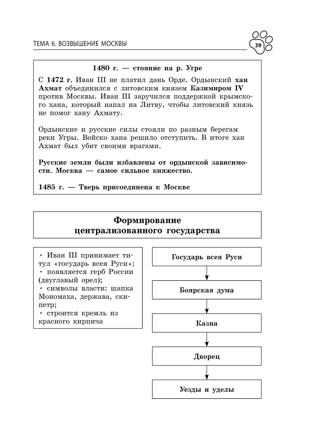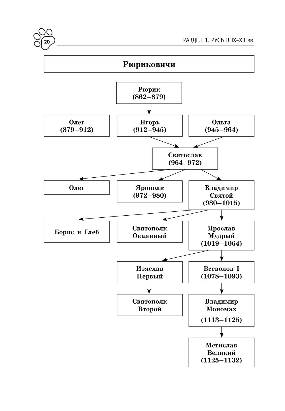 Приводятся сведения по историческим периодам: "Русь в IX-XII вв.", "Раздробленность и формирование единого государства", "Российское царство", "Начало империи. XIII в.", "Российская империя в XIX в.", "Первая половина XX в.", "Послевоенное развитие СССР", "Новая Россия". В конце каждой темы расположены списки необходимых терминов.
