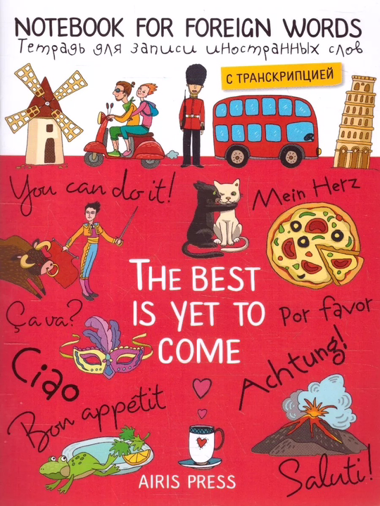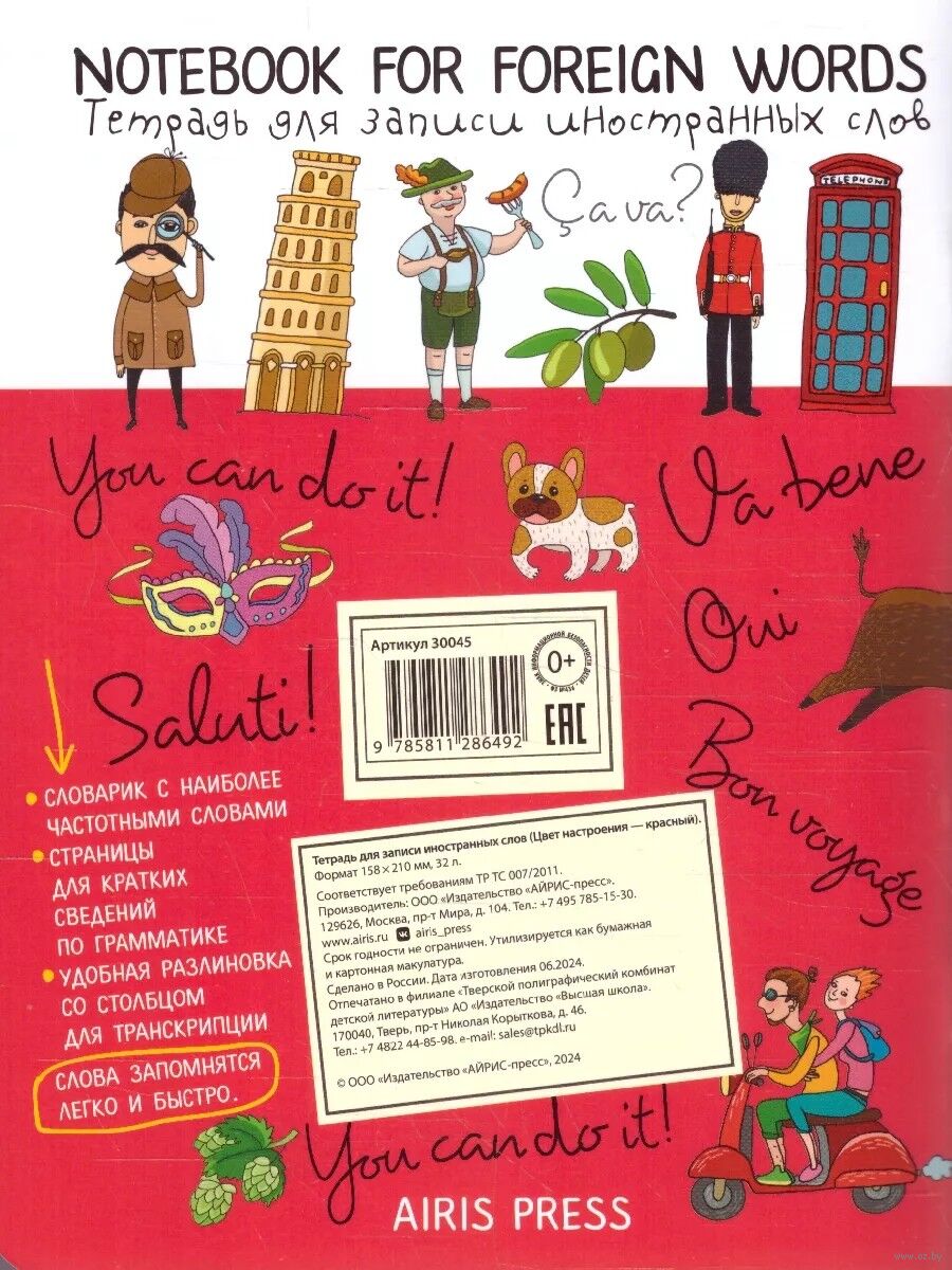Тетрадь для записи иностранных слов в привлекательной, прочной, ярко-красной глянцевой обложке поможет при изучении любого языка. Страницы в клетку расчерчены на три колонки. Удобная разметка позволяет записать несколько вариантов перевода и сопутствующую лексику (синонимы, антонимы и примеры употребления слова).