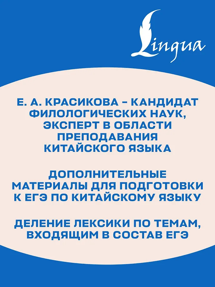 Красикова Елизавета Александровна – кандидат филологических наук, доцент кафедры подготовки преподавателей редких языков МГЛУ им. Мориса Тореза, методист по китайскому языку образовательного центра "Взлёт", функционирующего в структуре автономной некоммерческой общеобразовательной организации "Областная гимназия имени Е. М. Примакова", главный тренер сборной команды Московской области на Всероссийской олимпиаде школьников по китайскому языку.