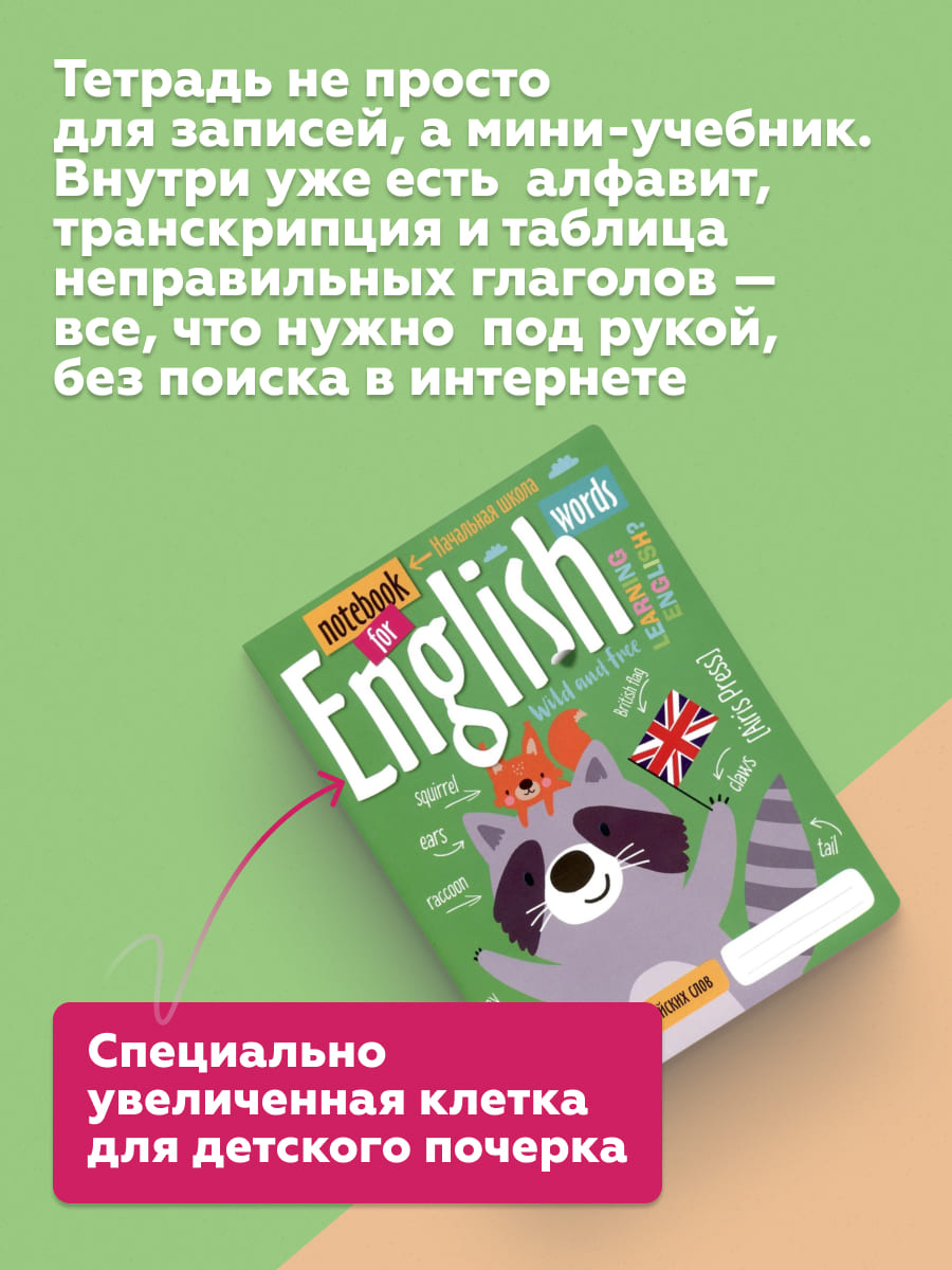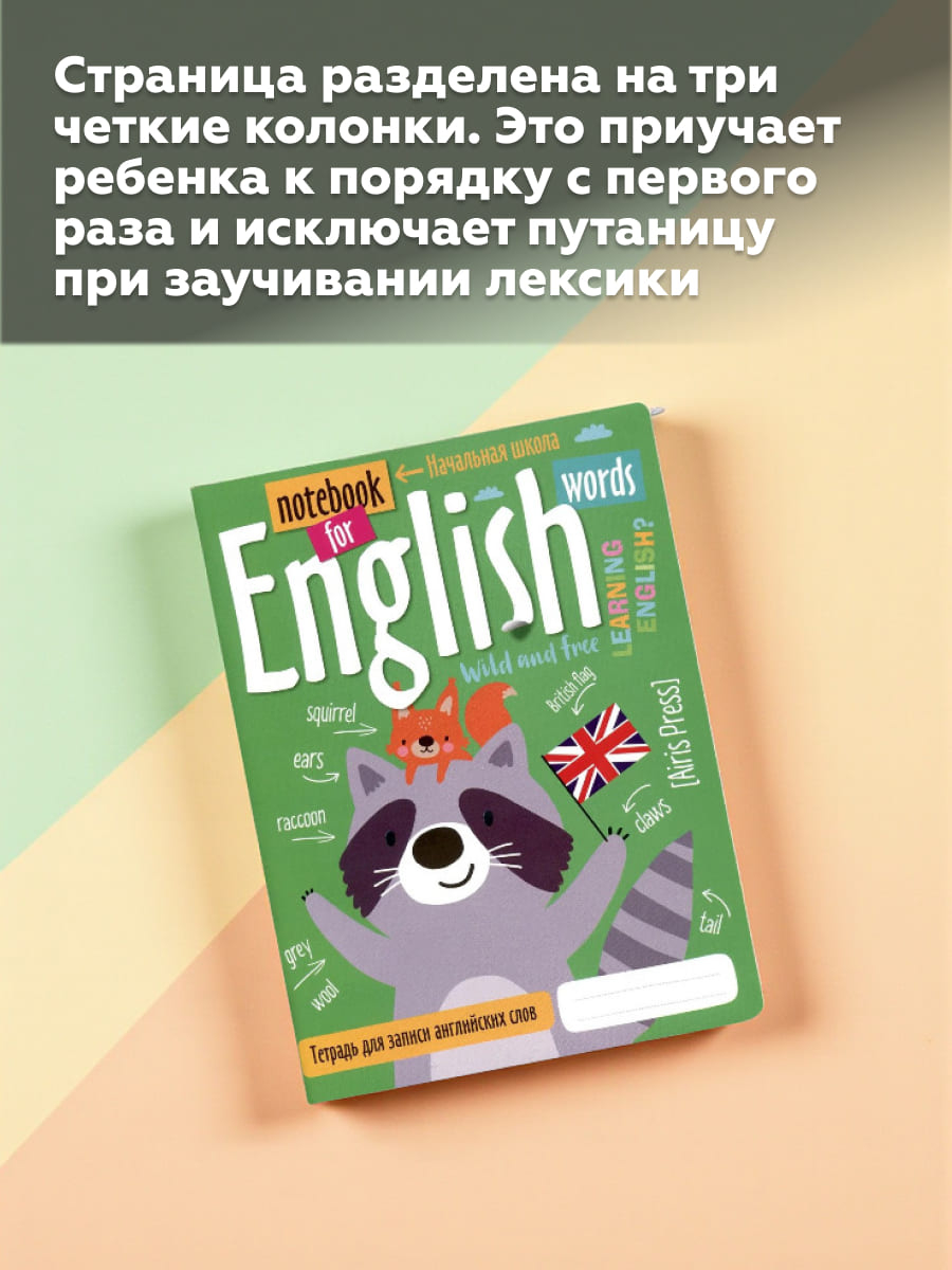 Страницы в тетради поделены на три колонки: слово, транскрипция и перевод. Крупные клетки идеально подходят для записей размашистым детским почерком. В этой тетради поместится много слов, а плотная глянцевая обложка позволит пользоваться тетрадью достаточно долго.