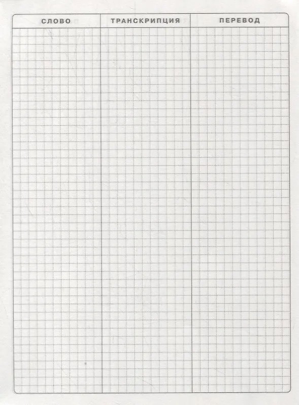 Тетрадь для новых английских слов с яркой глянцевой обложкой. На страницах в клетку три столбца: для записи слова, транскрипции и перевода. Удобная разметка позволяет также записать несколько вариантов перевода и сопутствующую лексику (синонимы, антонимы, примеры употребления).