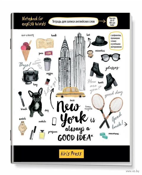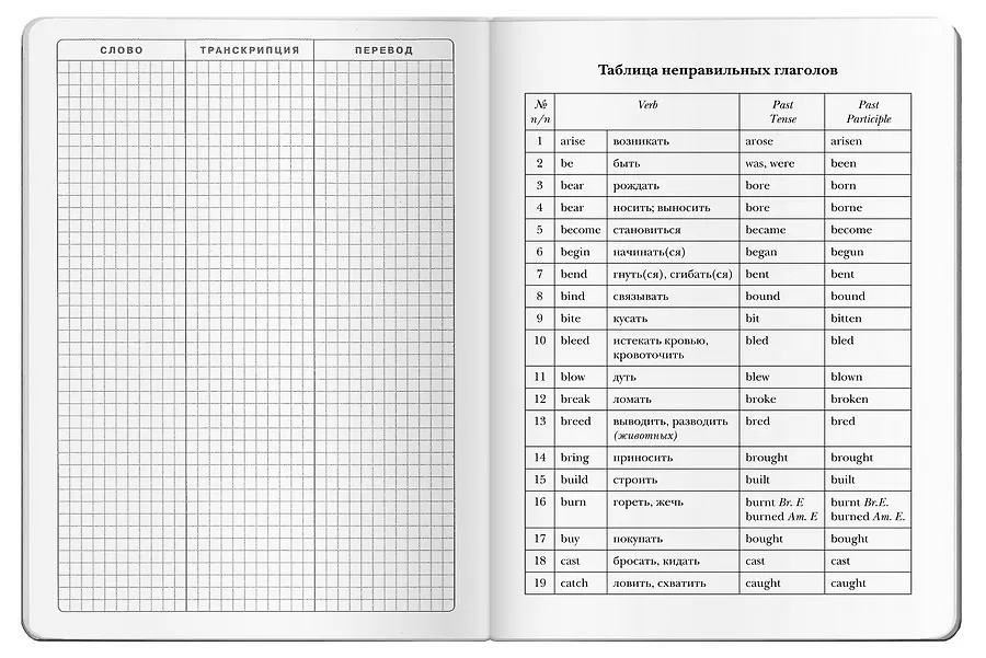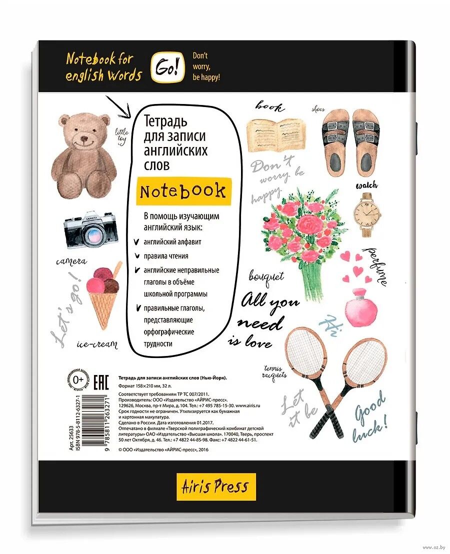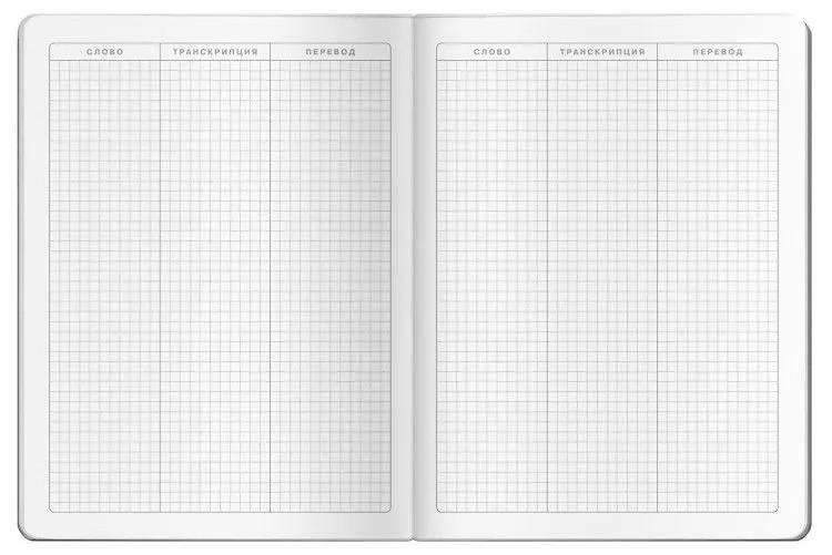 Эта тетрадь поможет выучить новые английские слова. Прочная глянцевая обложка оригинального современного дизайна с английской тематикой и блок в клетку. Листы расчерчены на три столбца: слово, транскрипция, перевод.