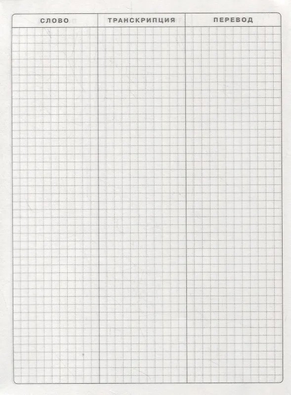 Удобная разметка страницы в клетку позволяет записать несколько вариантов перевода и сопутствующую лексику (синонимы, антонимы и примеры употребления слова).