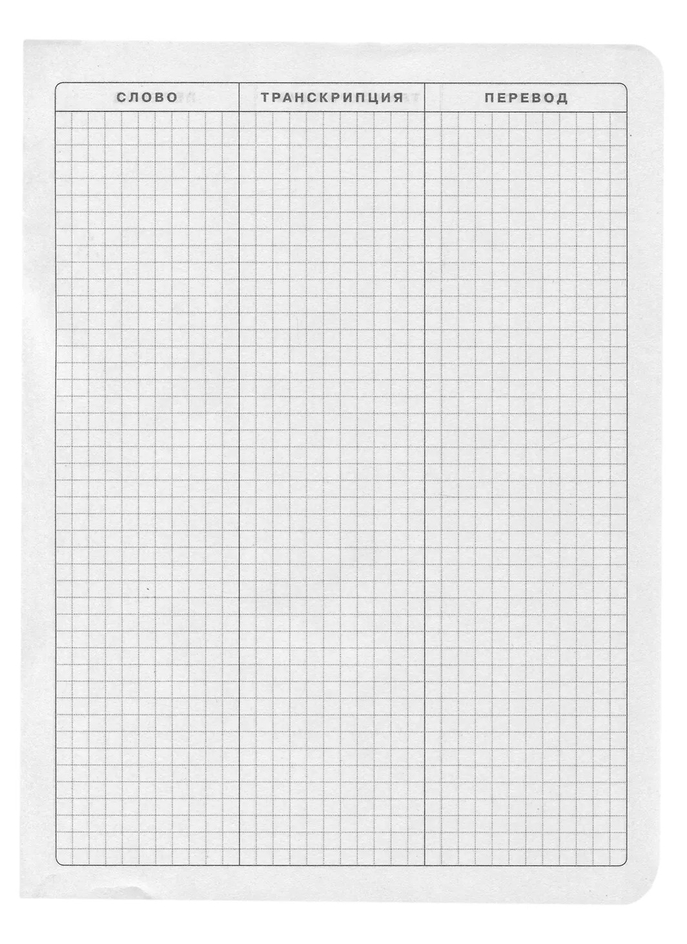 Удобная разметка страницы в клетку позволяет записать несколько вариантов перевода и сопутствующую лексику (синонимы, антонимы и примеры употребления слова).