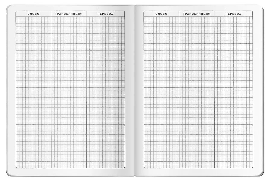 Эта тетрадь поможет выучить новые английские слова. Прочная глянцевая обложка оригинального современного дизайна с английской тематикой и блок в клетку. Листы расчерчены на три столбца: слово, транскрипция, перевод.