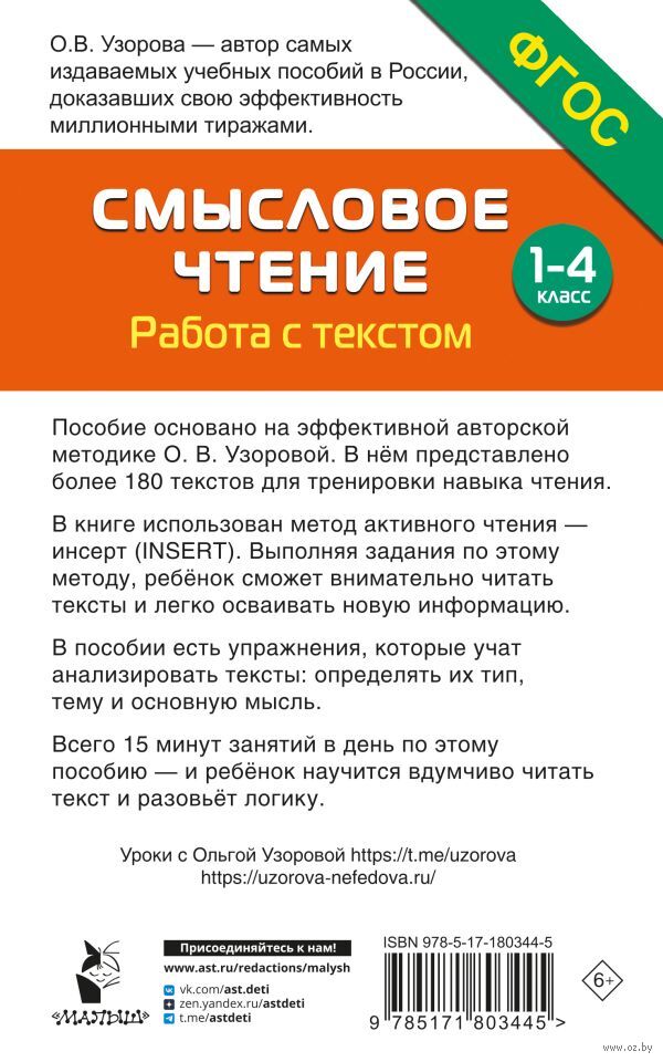 "Смысловое чтение. Работа с текстом. 1-4 класс" – пособие, основанное на эффективной авторской методике О. В. Узоровой. В книге 189 интересных текстов для чтения и задания для тренировки внимательности. Занятия по методу инсерт научат ребёнка легко осваивать новую информацию и анализировать её. В конце пособия расположены ответы ко всем заданиям для самопроверки.