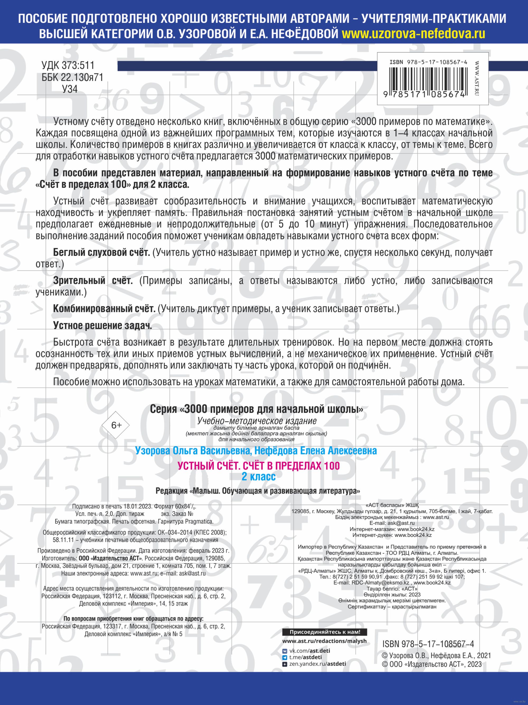 Устный счёт развивает сообразительность и внимание учащихся, воспитывает математическую находчивость и укрепляет память. Правильная постановка занятий устным счётом в начальной школе предполагает ежедневные и непродолжительные (от 5 до 10 минут) упражнения. Последовательное выполнение заданий пособия поможет ученикам овладеть навыками устного счёта всех форм.