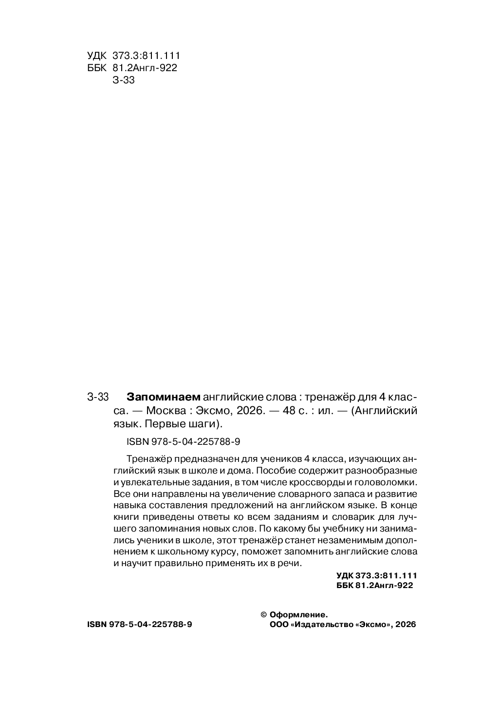 Тренажёр предназначен для учеников 4 класса, изучающих английский язык в школе и дома. Пособие содержит разнообразные и увлекательные задания, в том числе кроссворды и головоломки. Все они направлены на увеличение словарного запаса и развитие навыка составления предложений на английском языке. В конце книги приведены ответы ко всем заданиям и словарик для лучшего запоминания новых слов.