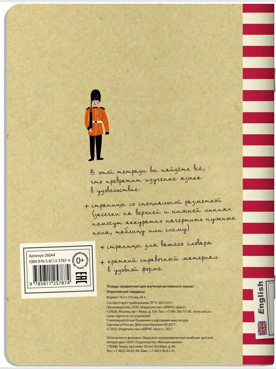 Предметная тетрадь "Королевский гвардеец" содержит все необходимое для изучения английского языка. Блок-трансформер с засечками позволит расчертить страницы так, как вам удобно. В тетради есть также блок с тремя столбцами, что позволит вам составить собственный словарь с транскрипцией и переводом. В конце тетради вы найдете удобно структурированный справочный материал.