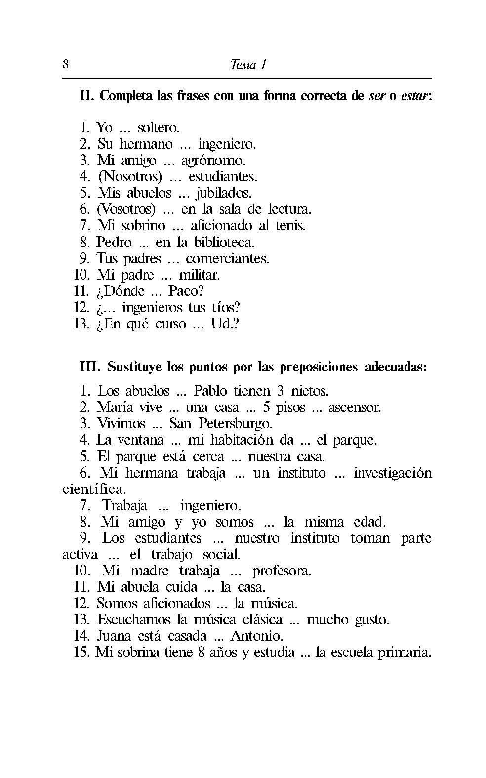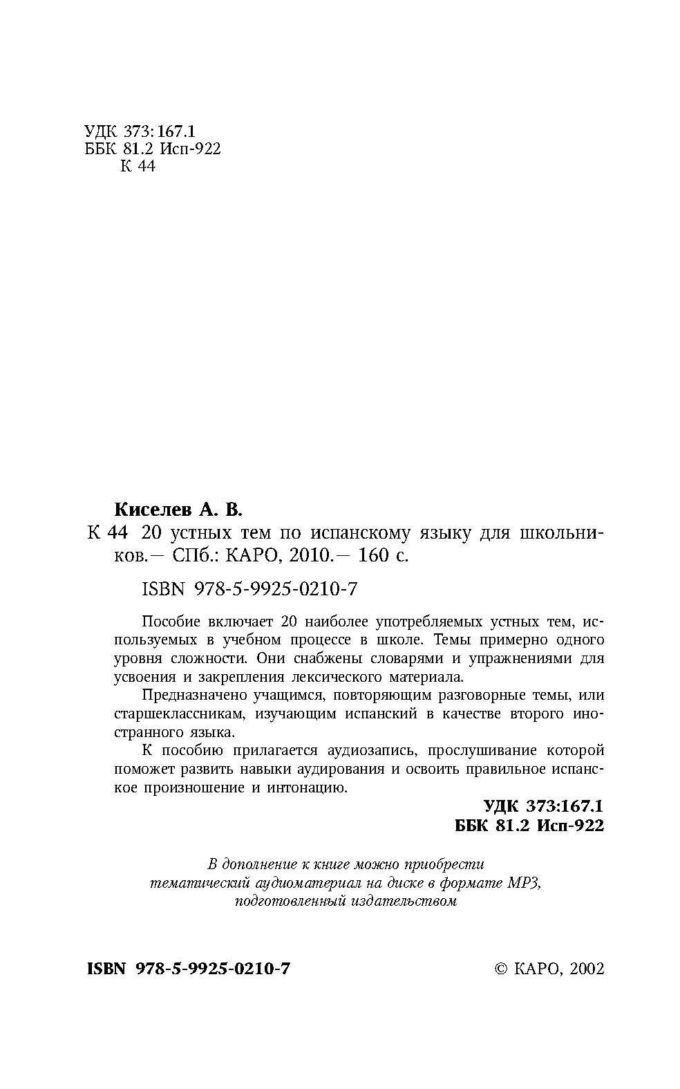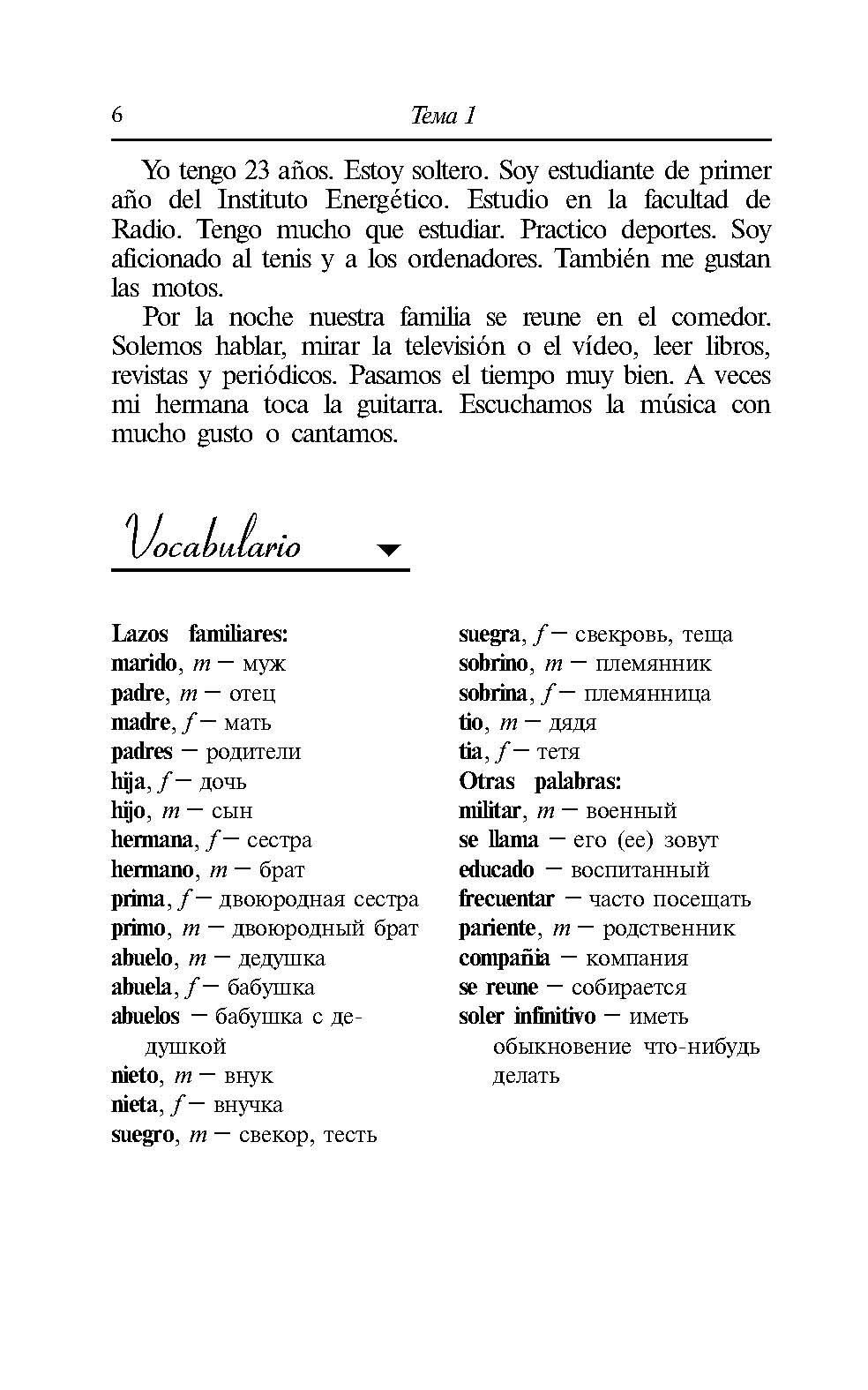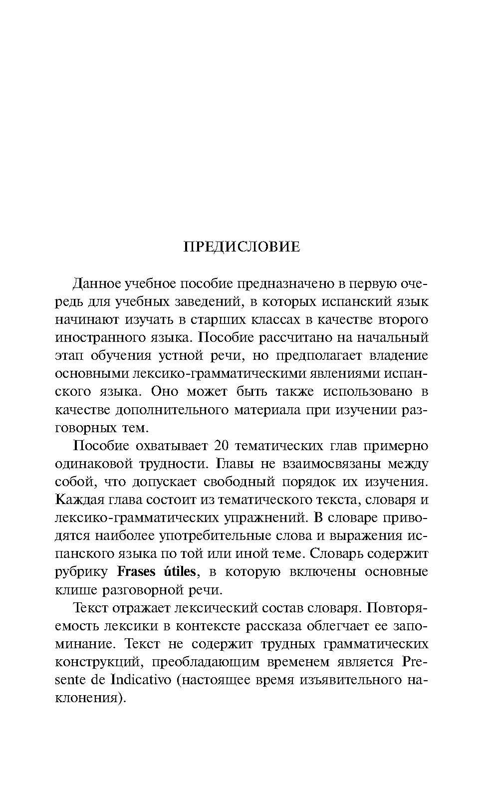 Предназначено для учащихся, повторяющих разговорные темы, или старшеклассников, изучающих испанский язык в качестве второго иностранного.