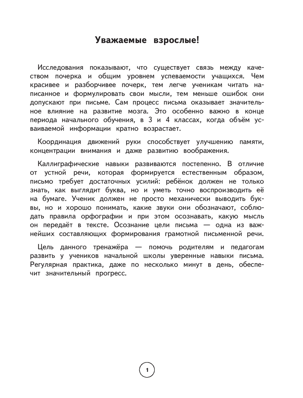 Универсальное пособие предназначено для надёжного запоминания эталонного написания букв и правильного их соединения. Данный тренажёр научит младших школьников писать не только разборчиво, но и красиво. В основе тетради лежит нейропсихологический подход, который предполагает совмещение заданий каллиграфического характера с упражнениями для развития письменной речи.
