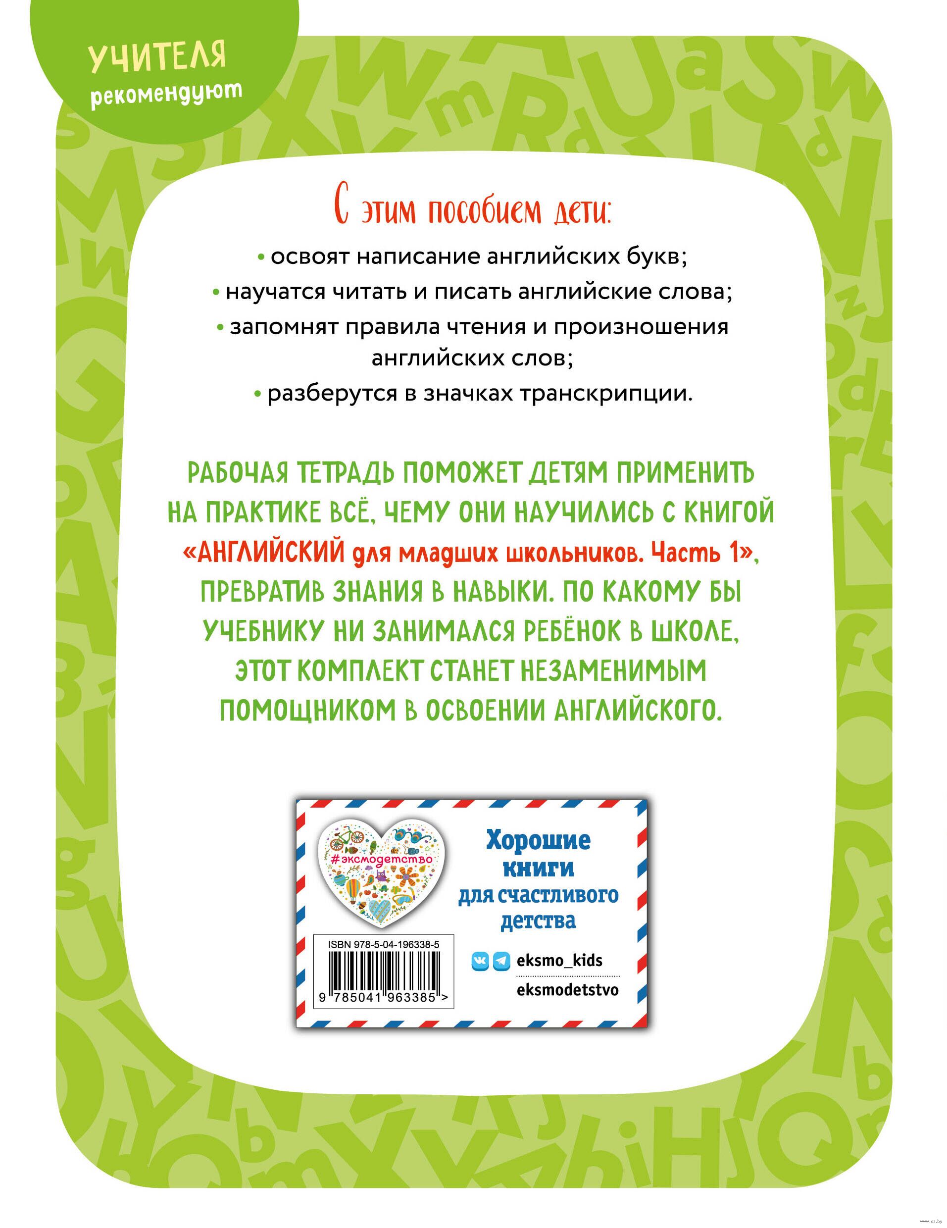 Преподаватели и репетиторы, которые помогают младшим школьникам осваивать английский язык, высоко ценят комплект "Английский для младших школьников". Рабочая тетрадь содержит множество весёлых заданий, с которыми легко будет научиться читать и писать по-английски, освоить английские буквы и знаки транскрипции, повторить слова, с которыми учащийся познакомился в книге. По какому бы учебнику ребёнок ни занимался в школе, "Английский для младших школьников" поможет ему уверенно освоить основы английского языка, заложив надёжную базу для совершенствования в нём.