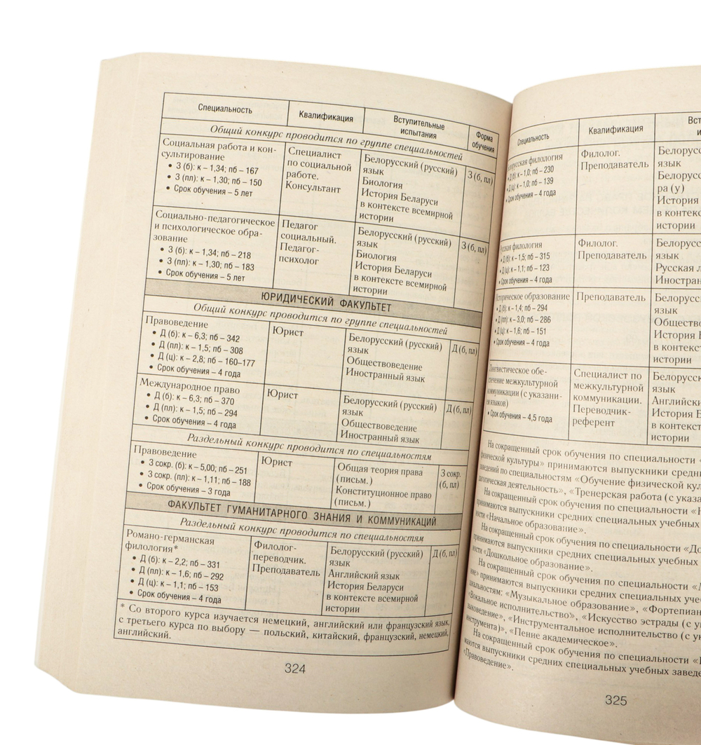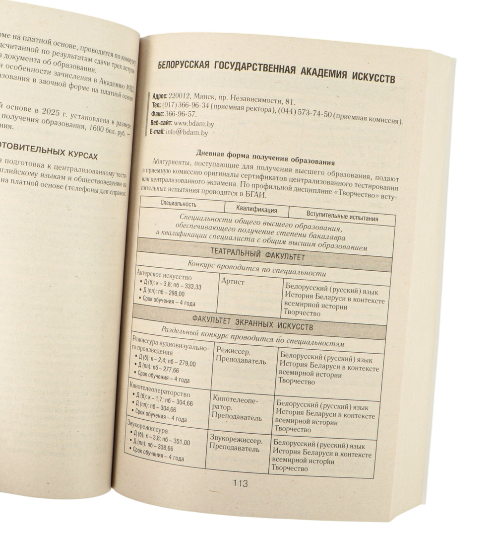 В справочнике содержатся Правила приема лиц для получения общего высшего и специального высшего образования в Республике Беларусь и информация об учреждениях высшего образования (адрес, веб-сайт, факультеты, специальности, формы получения образования, вступительные испытания, конкурс и проходной балл в 2025 году, порядок приема).