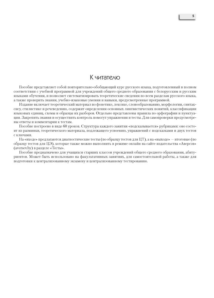 Пособие представляет собой повторительно-обобщающий курс русского языка, подготовленный в полном соответствии с учебной программой для учреждений общего среднего образования с белорусским и русским языками обучения. Содержит теоретические сведения по всем разделам русского языка (орфография, пунктуация, фонетика, орфоэпия, лексика, словообразование, морфология, синтаксис, стилистика), упражнения, диагностические и промежуточные тесты с ответами и комментариями, а также итоговые тесты, которые можно выполнить в режиме онлайн на сайте.