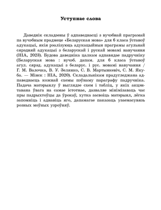 Даведнік змяшчае матэрыял па ўсіх тэмах курса беларускай мовы 6 класа, складзены ў адпаведнасці з новымі правіламі беларускай арфаграфіі. Правілы пададзены ў выглядзе схем і табліц, што дазволіць структурыраваць матэрыял, зрабіць яго наглядным, палегчыць засваенне. Асаблівая ўвага надаецца фарміраванню моўнай і маўленчай дзейнасці вучняў, выпрацоўцы арфаграфічных і пунктуацыйных навыкаў.