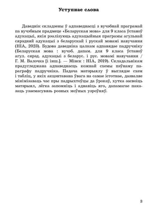 Даведнік змяшчае матэрыял па ўсіх тэмах курса беларускай мовы 9 класа, складзены ў адпаведнасці з новымі правіламі беларускай арфаграфіі. Правілы пададзены ў выглядзе схем і табліц, што дазволіць структурыраваць матэрыял, зрабіць яго наглядным, палегчыць засваенне. Асаблівая ўвага надаецца фарміраванню моўнай і маўленчай дзейнасці вучняў, выпрацоўцы арфаграфічных і пунктуацыйных навыкаў.