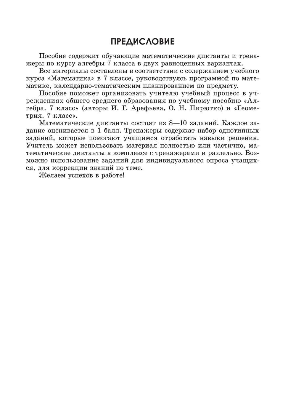 Все материалы составлены в соответствии с содержанием учебного курса "Математика" в 7 классе, руководствуясь программой по математике, календарно-тематическим планированием по предмету. Пособие поможет организовать учителю учебный процесс в учреждениях общего среднего образования по учебному пособию "Алгебра. 7 класс" (авторы И. Г. Арефьева, О. Н. Пирютко) и "Геометрия. 7 класс". Математические диктанты состоят из 8-10 заданий. Каждое задание оценивается в 1 балл. Тренажеры содержат набор однотипных заданий, которые помогают учащимся отработать навыки решения.