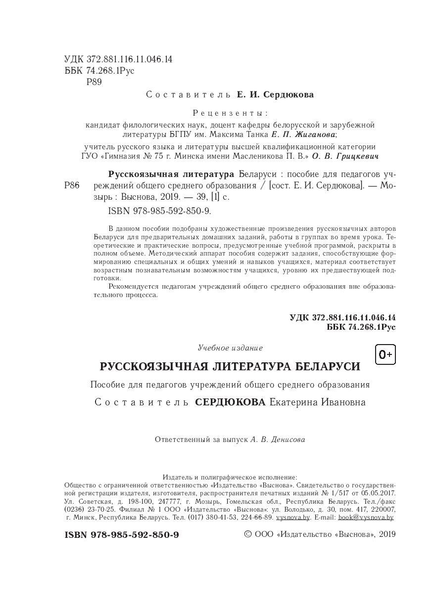 | Изготовитель | ООО "Издательство "Выснова". РБ, 247777, г. Мозырь, Гомельская область, ул. Советская, д.198-100. |