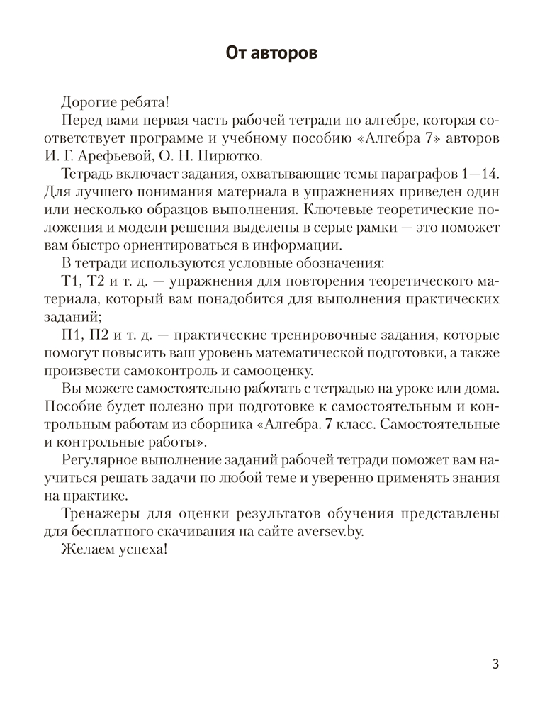 Содержание рабочей тетради соответствует программе и учебному пособию по алгебре авторов И. Г. Арефьевой, О. Н. Пирютко.