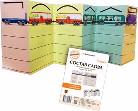 Тема "Состав слова" является для учащихся сложной и вместе с тем очень важной. Наглядное пособие предлагает представить слово в виде поезда и на его примере разобрать состав. Пособие представляет из себя трансформер, с помощью которого можно собирать любой необходимый для изучения в 3 классе состав слова.
