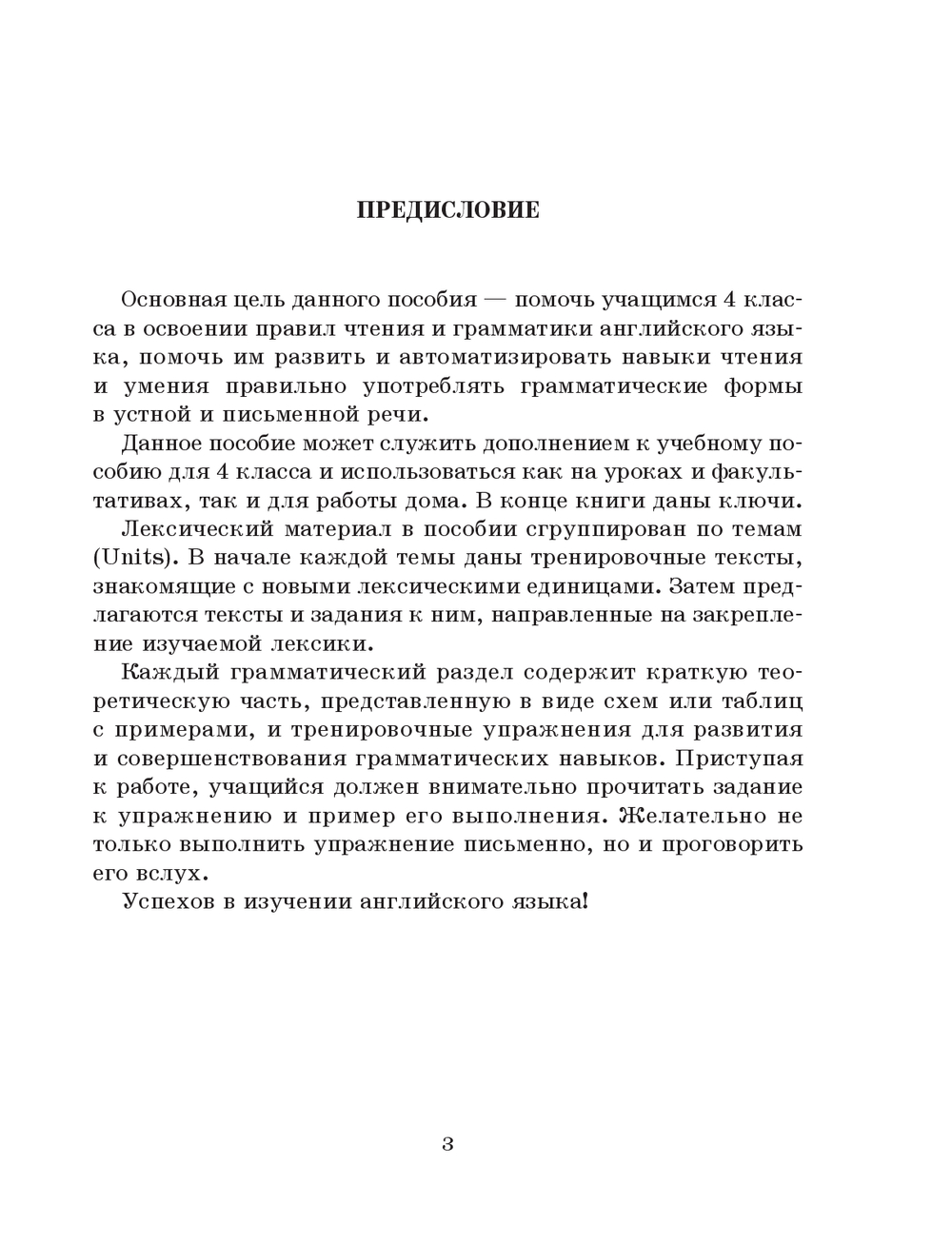 Хороший учебник формата А4 для отработки и закрепления грамматики английского языка для 4 класса. Темы соответствуют школьному учебнику. Есть опорные таблицы с правилами. Упражнения в каждой теме идут от простого к сложному. В конце книги есть ответы к упражнениям.