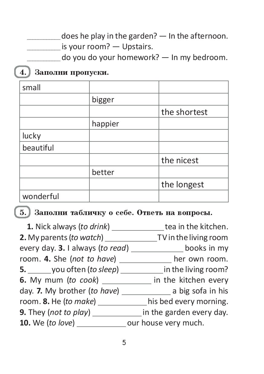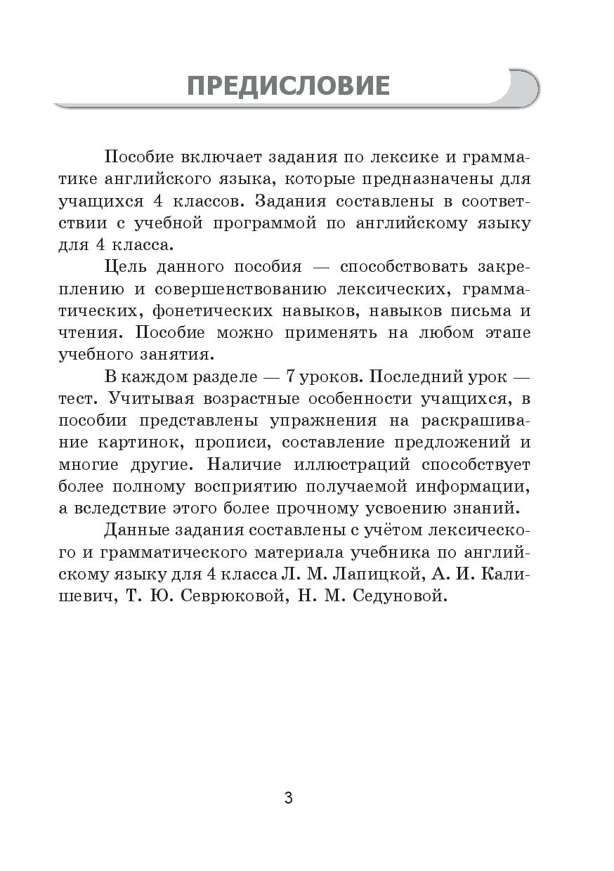 Пособие включает задания по лексике и грамматике английского языка, которые предназначены для учащихся 4 классов. Задания составлены в соответствии с учебной программой по английскому языку для 4 класса.