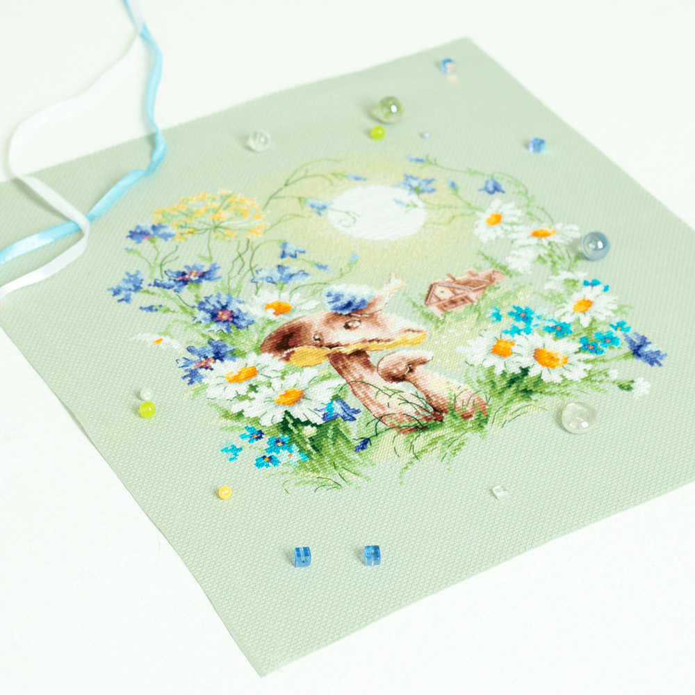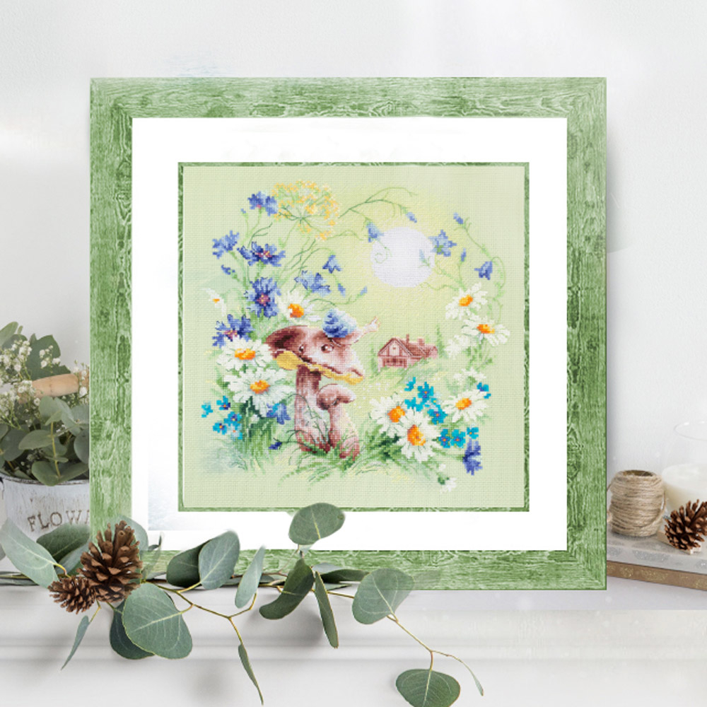 С помощью техник счетного креста, полукреста и бэкстича вы сможете вышить детальное и живое изображение по мотивам неспешного летнего дня.