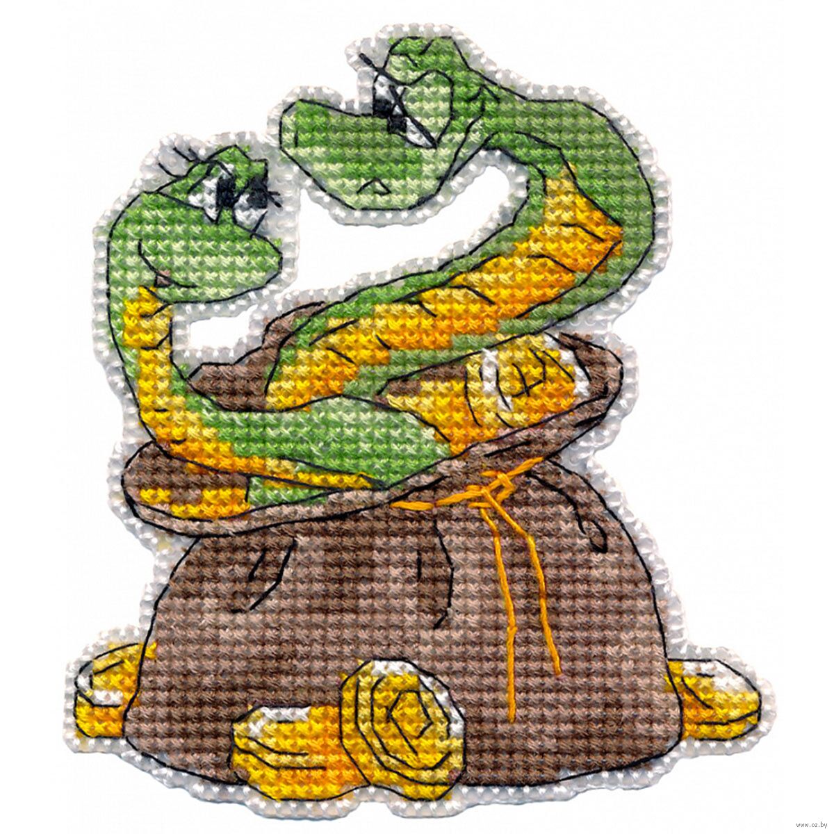 Магниты, вышитые на пластиковой канве, представляют собой оригинальные сувениры и прекрасные подарки. Вышитый собственными руками магнит с изображением влюбленных змеек в мешке с золотом станет не только прекрасным украшением для вашего холодильника, но и незабываемым подарком на новгодние праздники.