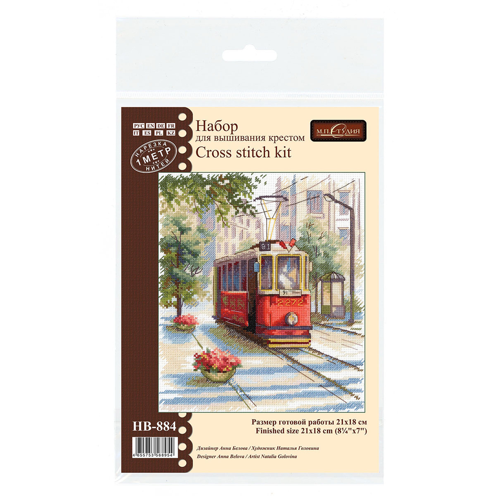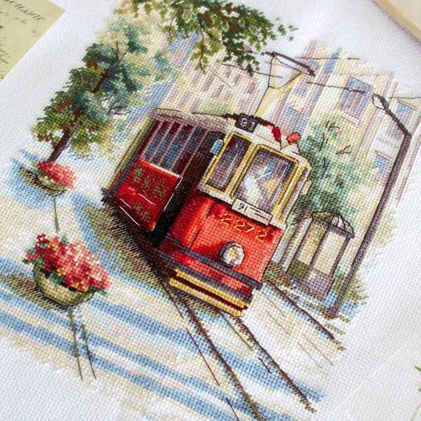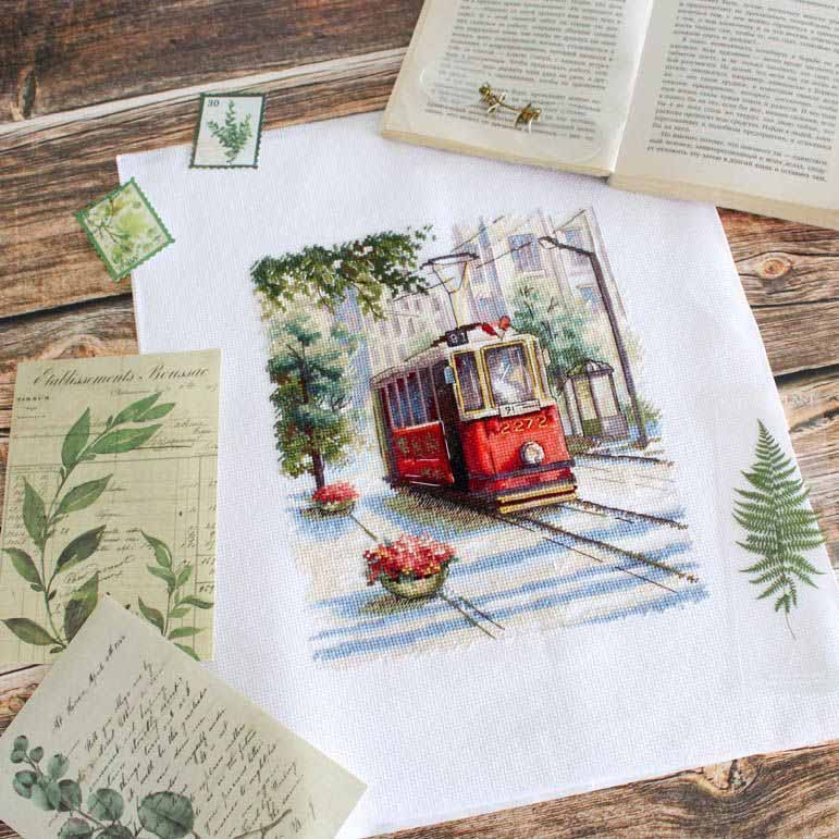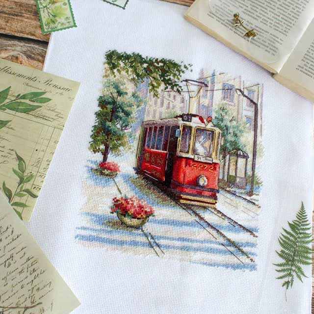 Сюжет "Старый трамвайчик" вышивается в разных техниках: "крест'"позволяет делать цветовое заполнение, штрихи в технике "полукрест" придают изображению динамичность и эффект прозрачности, а стежки "бэкстич" создают четкие контрастные контуры. Готовая картина напоминает рисунок карандашами или акварелью.