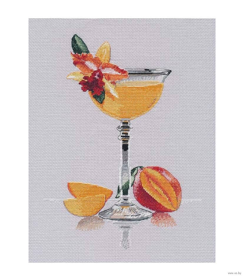 Изображение бокала, окруженного яркими цветами и сочными фруктами, перенесет вас в мир тропических каникул. Каждый стежок словно дышит жизнью, а гармоничная палитра делает вышивку особенно привлекательной.
