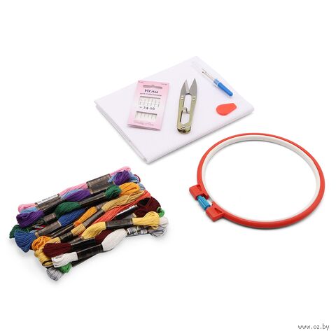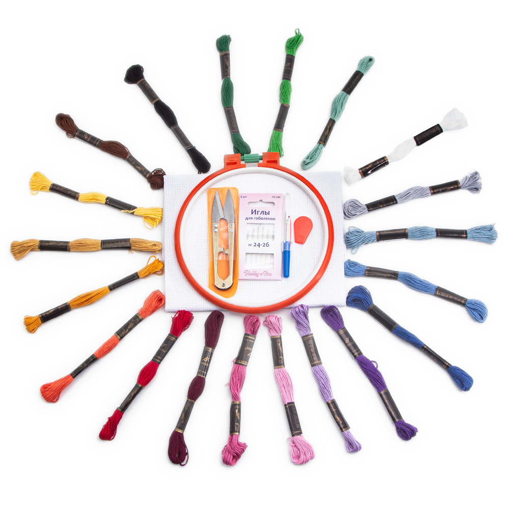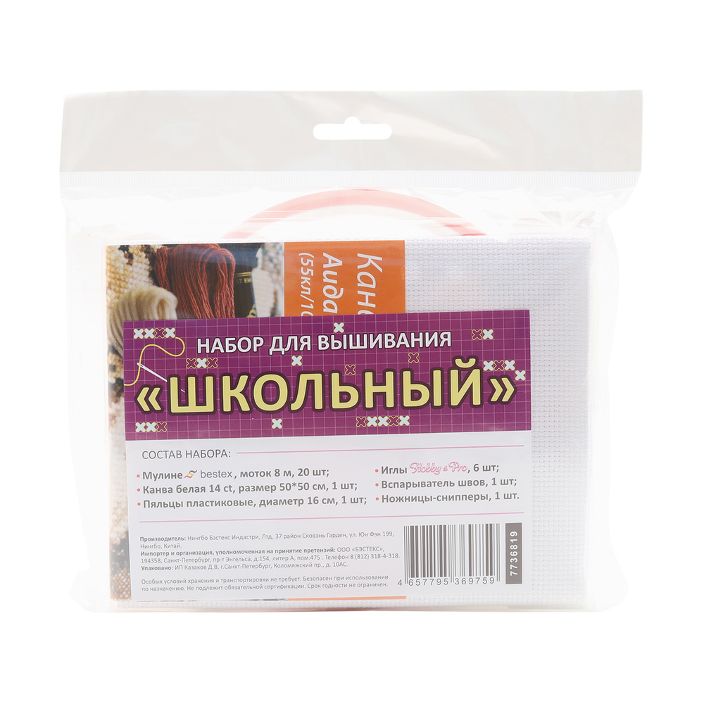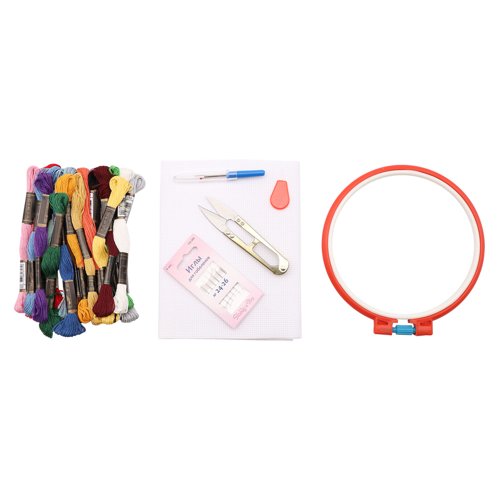 В упаковке: набор мулине Bestex – 20 шт.; канва 50x50 см, белая Bestex – 1 шт.; пяльцы пластиковые 160 мм – 1 шт.; ножницы д/прорез.петель мет. – 1 шт.; вспарыватель, малый – 1 шт.; нитковдеватель, пластик – 1 шт.; иглы ручные гобеленовые №24-26, 6 шт. – 1 упак.