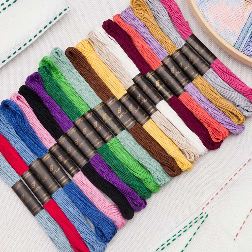 Каждая пасма состоит из 6 отдельных тонких нитей. Благодаря новейшим технологиям мулине Bestex яркие, легкие, равномерные по всей длине. Утолщения и узелки практически не встречаются. Четко выраженная структура нити позволяет использовать мулине для сюжетов со сплошной зашивкой.