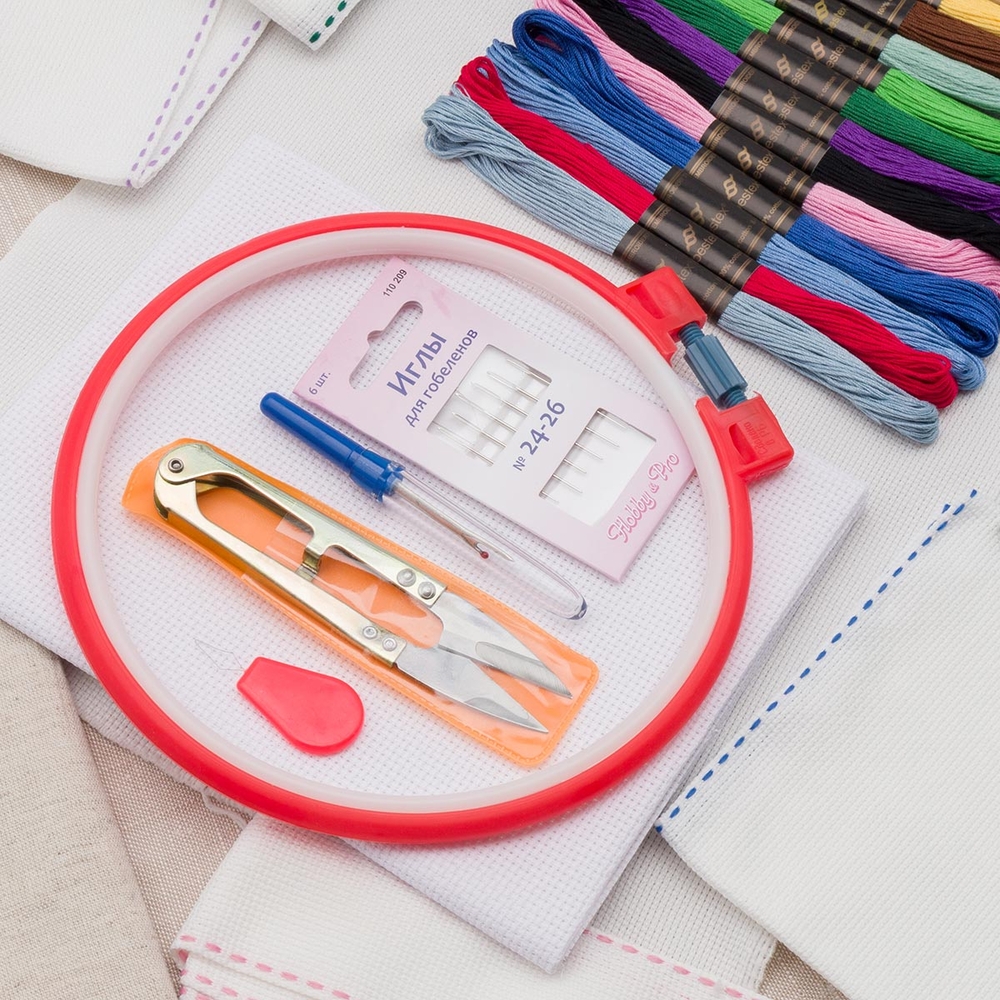 Вам не придется подбирать иглы и пяльцы, чтобы приступить к вышивке – они уже входят в комплект. Ножницы помогут аккуратно подрезать нить, а вспарыватель – быстро убрать нежелательные стежки. В комплект также входит канва Bestex 14 каунта – она подходит для любой вышивки крестом, от простых детских сюжетов до картин с полной зашивкой и большим количеством цветов.