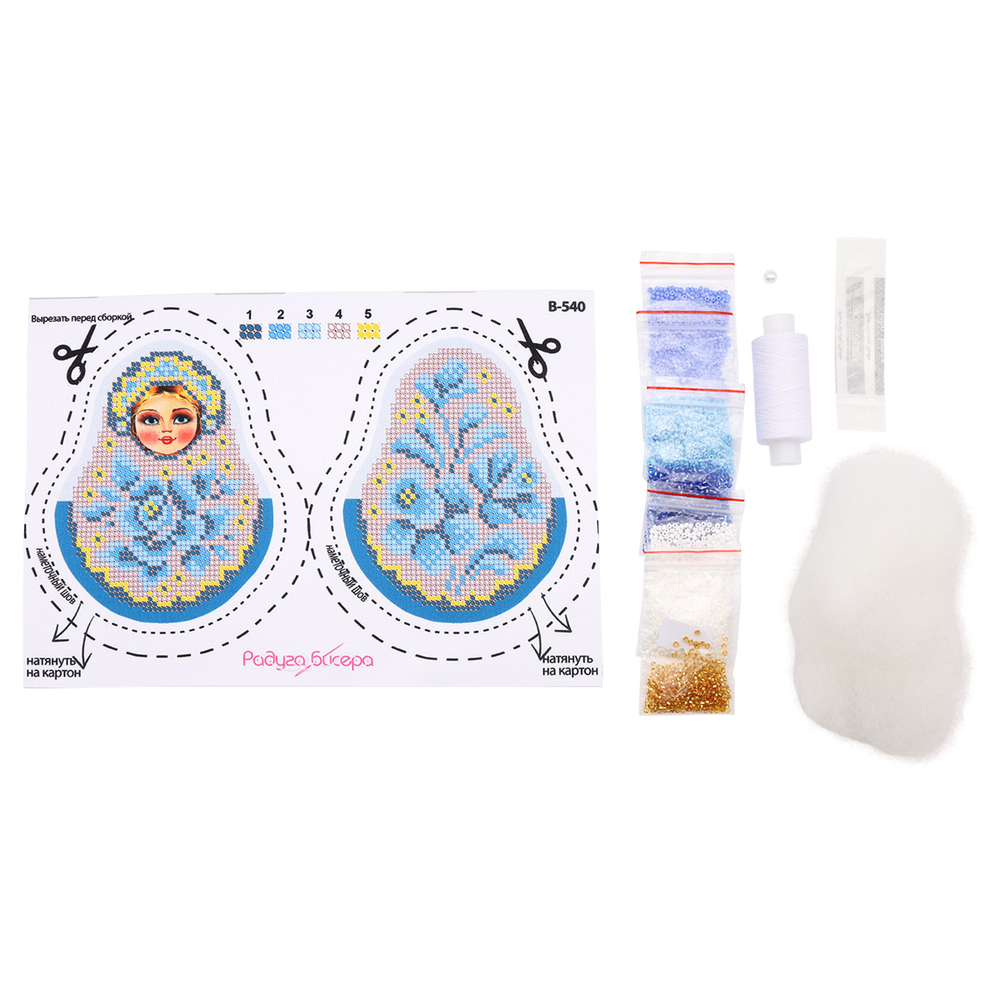 В наборе: ткань с нанесённым рисунком-схемой, бисер, нитки для бисера, игла, синтепух, инструкция.