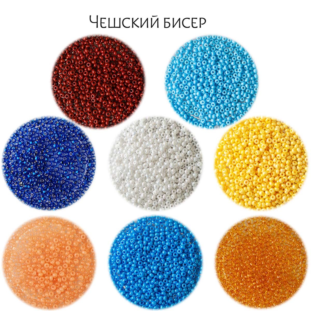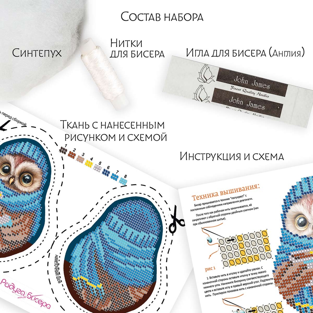 В наборе: бисер (Чехия), основа для вышивания с нанесенным рисунком и схемой, игла (Англия), нитки, наполнитель для игрушки (синтепух), схема, подробная инструкция.