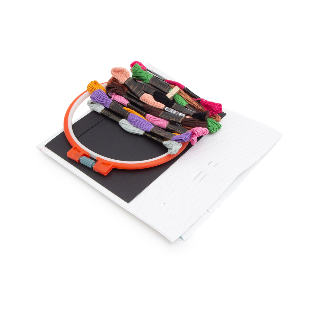 В наборе: канва хлопковая 14 каунта средней жесткости белая Bestex, мулине Bestex, пяльцы пластиковые 160 мм, игла ручная гобеленовая №24 (1 шт.), растяжка с фоторамкой 9х13 см и прищепками.