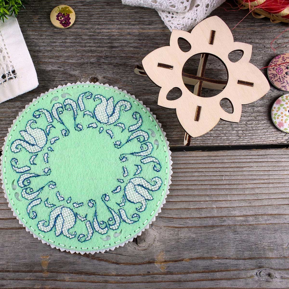 Процесс вышивания на фетре не требует особых навыков и подойдет как для опытных рукодельниц, так и для новичков. Вышивка выполняется в технике счетный крест, назад иголку (бэкстич), что позволяет тщательно проработать все детали изображения, делая его реалистичным и выразительным.