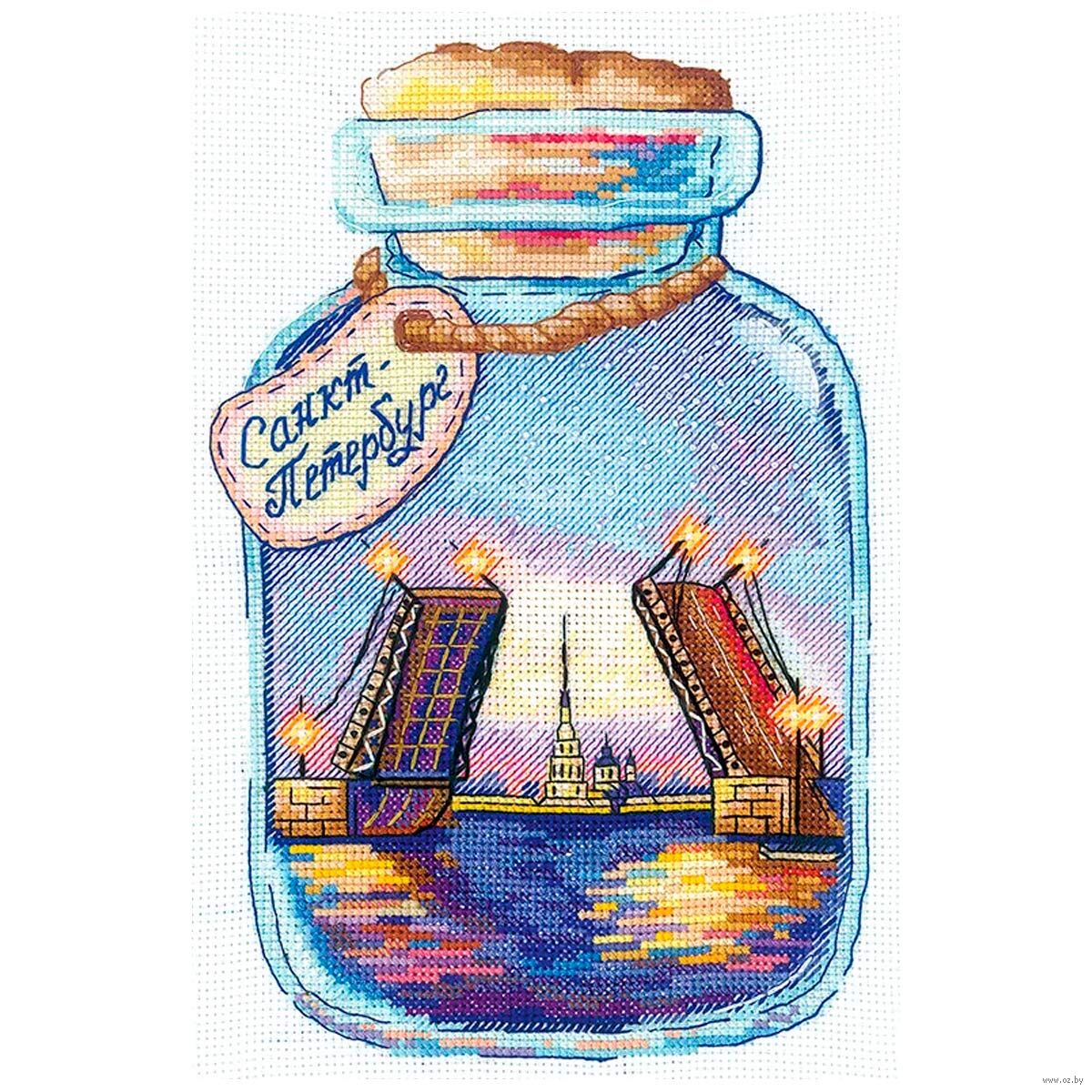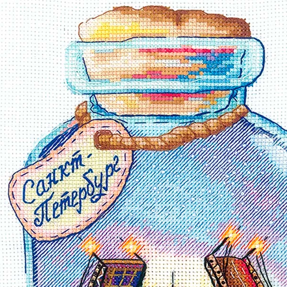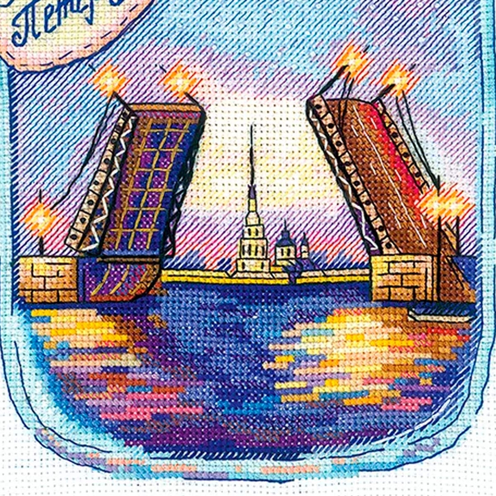 В наборе для вышивки крестом "Города в банках. Питер" используется канва Aida 16 каунта – этот материал позволяет вышивать небольшими стежками и прекрасно подходит для схем с подробной детализацией.