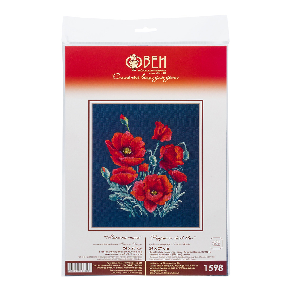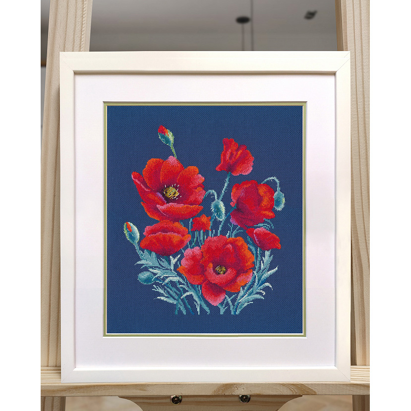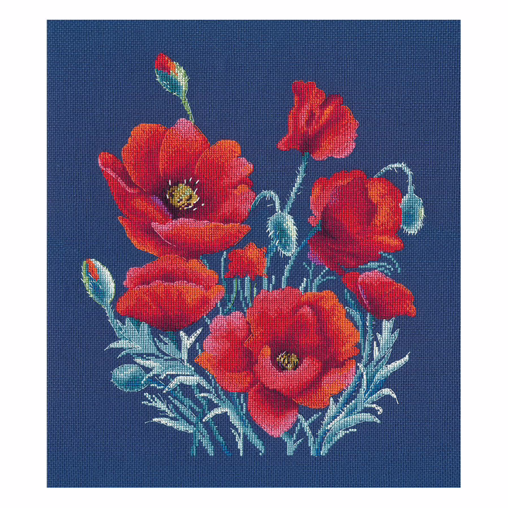 Сюжет Маки на синем от ОВЕН – настоящий фейерверк алых красок на темно-синем фоне канвы Aida 16 каунта.