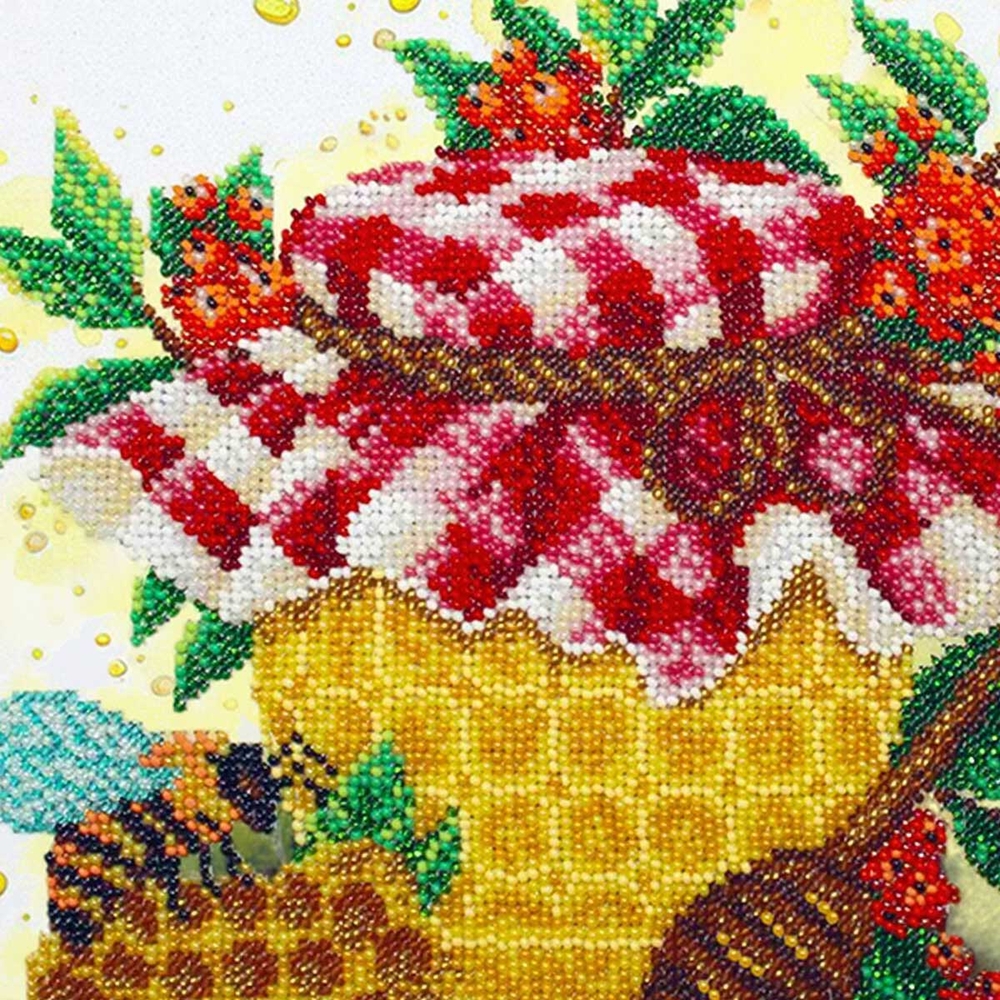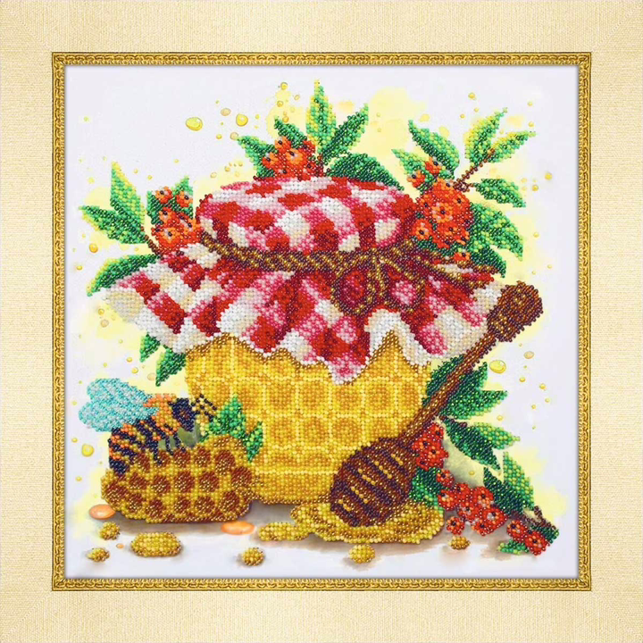 Вышивка бисером выполнена с особой тщательностью: на картине изображена аппетитная баночка меда, окруженная сочными и спелыми ягодами. Каждая деталь пронизана жизненной энергией, создавая ощущение лета и сладости. На баночке меда блестят капли, отражающие свет благодаря использованию бисера различных оттенков. Разнообразие цветов бисера позволяет создать богатые и насыщенные оттенки, а также передать текстуру и фактуру картины. Такая картина бисером может стать не только оригинальным украшением интерьера, но и замечательным подарком, который несет в себе положительную энергетику.
