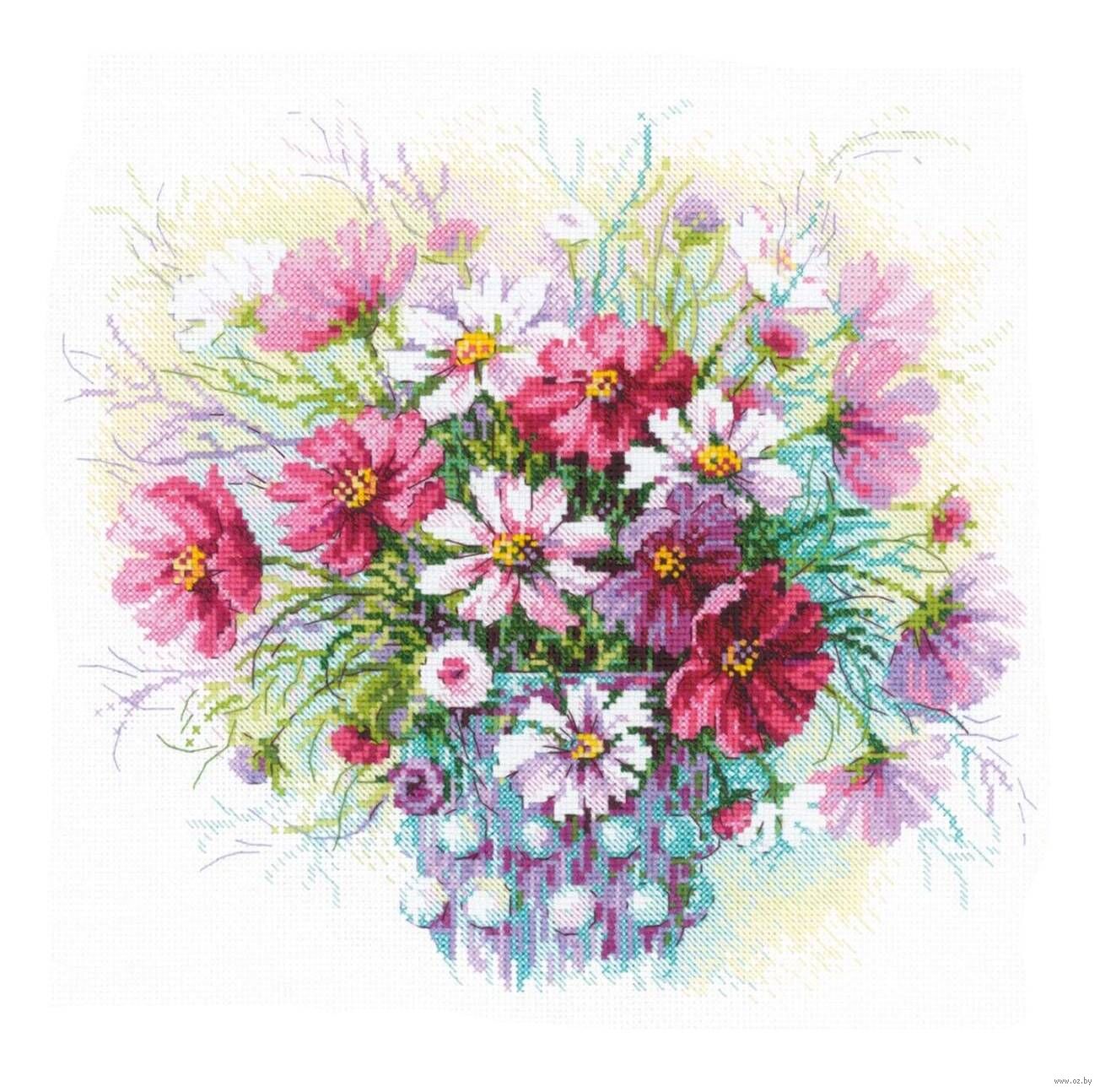 Вышитый букет акварельных космей будет радовать глаз и согревать душу долгие годы, напоминая о теплых летних днях и красоте природы. Нежные лепестки, словно тронутые кистью художника, переливаются оттенками розового, лилового и белого.
