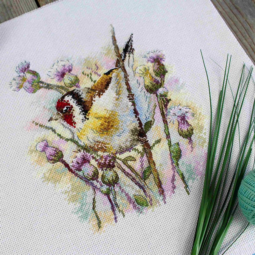 Чертополох, с его характерными яркими цветами, окружает притаившегося щегла, придавая вышивке атмосферу дикой природы. Каждая деталь выполнена с любовью и вниманием. Каждый шаг вышивания будет наполнен радостью и вдохновением, а готовая работа станет ярким акцентом в вашем интерьере или замечательным подарком для близких.