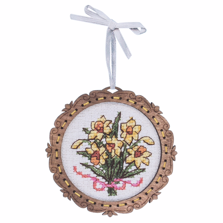 Букет нарциссов представляет собой уникальную возможность создать красивую и оригинальную вышивку с минимальными усилиями. Основа из фанеры не только обеспечивает прочность и долговечность работы, но и создает особый эстетический эффект, подчеркивая натуральность и теплоту материала.