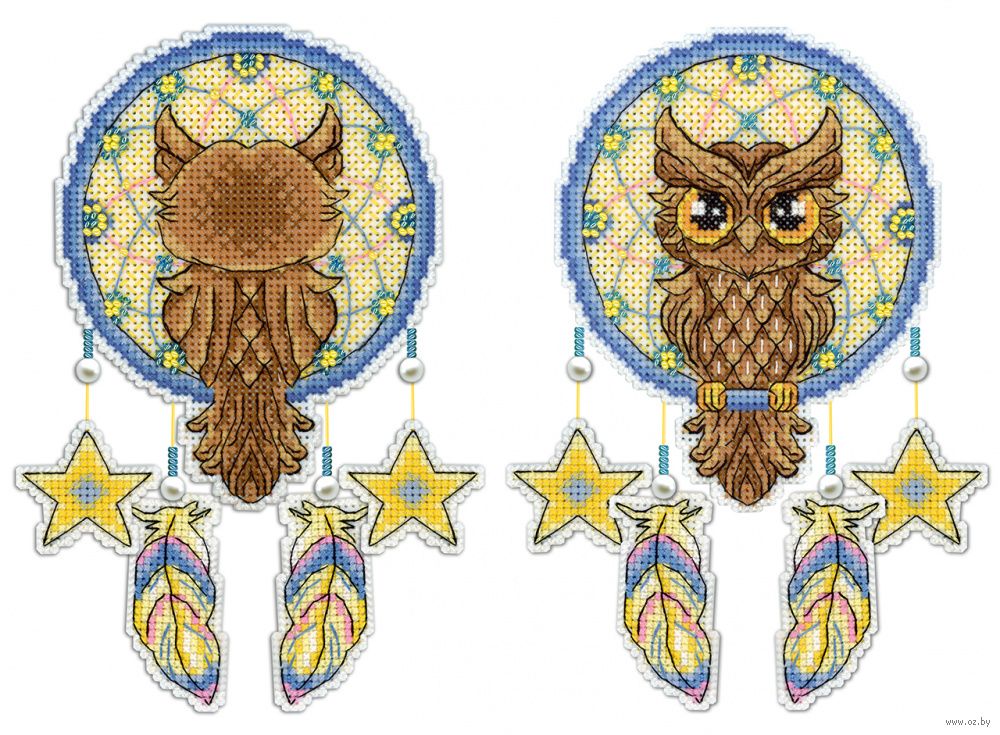 Обе стороны вышиваются согласно схеме, затем вырезаются по контуру, обозначенному в руководстве по вышиванию, и сшиваются изнаночными сторонами внутрь.