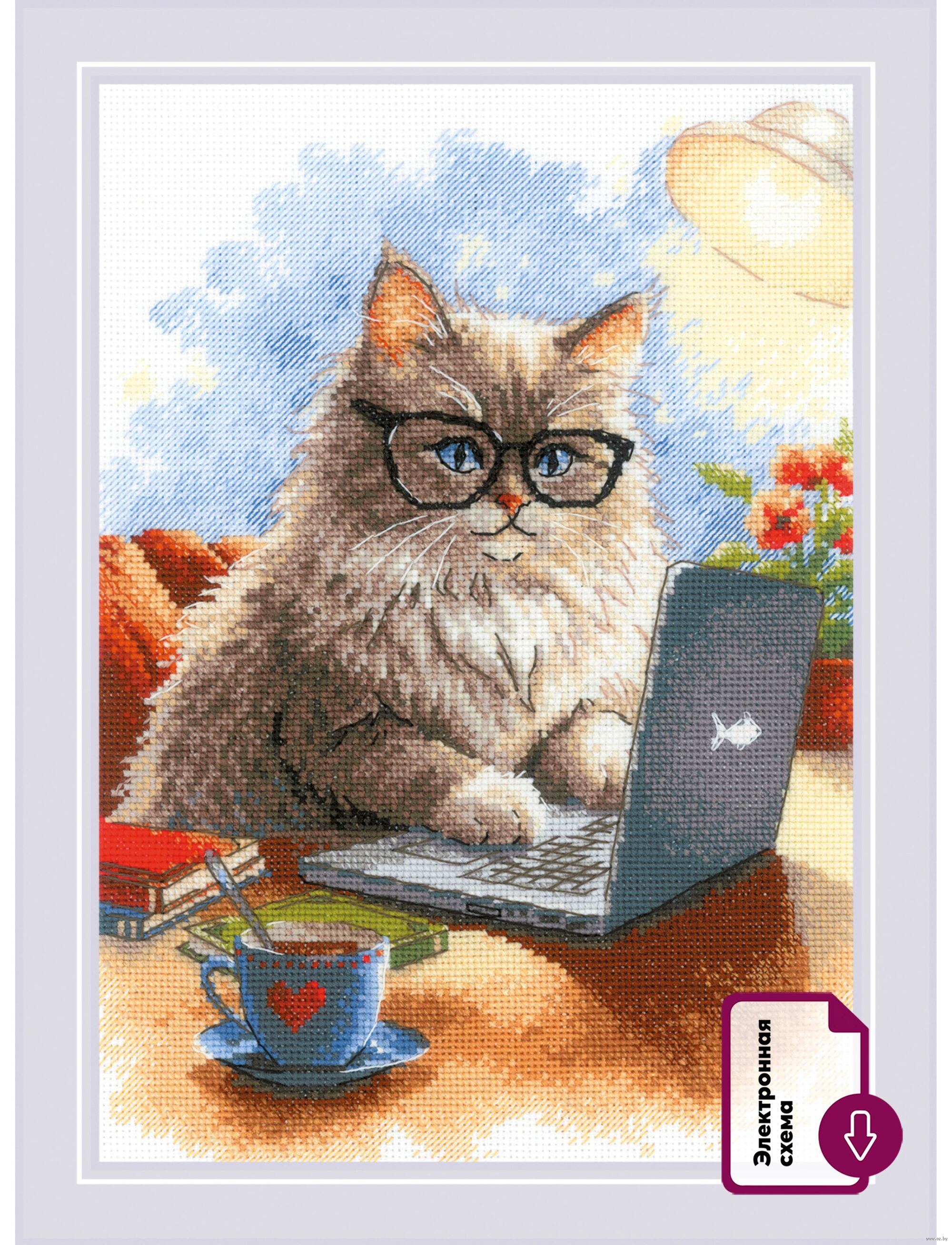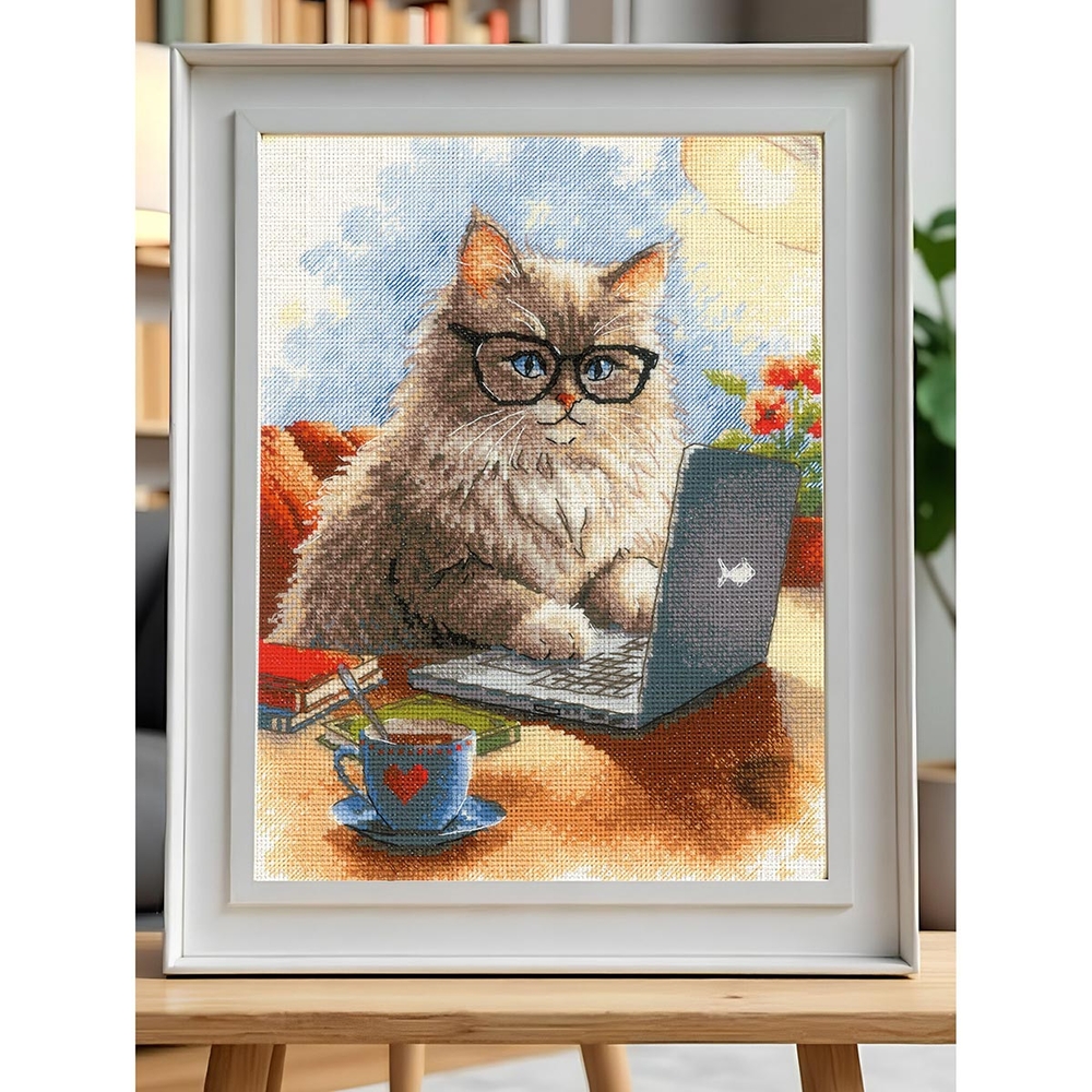 Вы сможете создать уникальное и неповторимое украшение комнаты, которое будет напоминать о ваших талантах и ручной работе. Вышивка крестиком – прекрасный подарок маме, бабушке, сестре, подруге на Новый Год, день рождения, новоселье и 8 марта. Милая и очаровательная картина с изображением кота, занятого писательским процессом, никого не оставить равнодушным.
