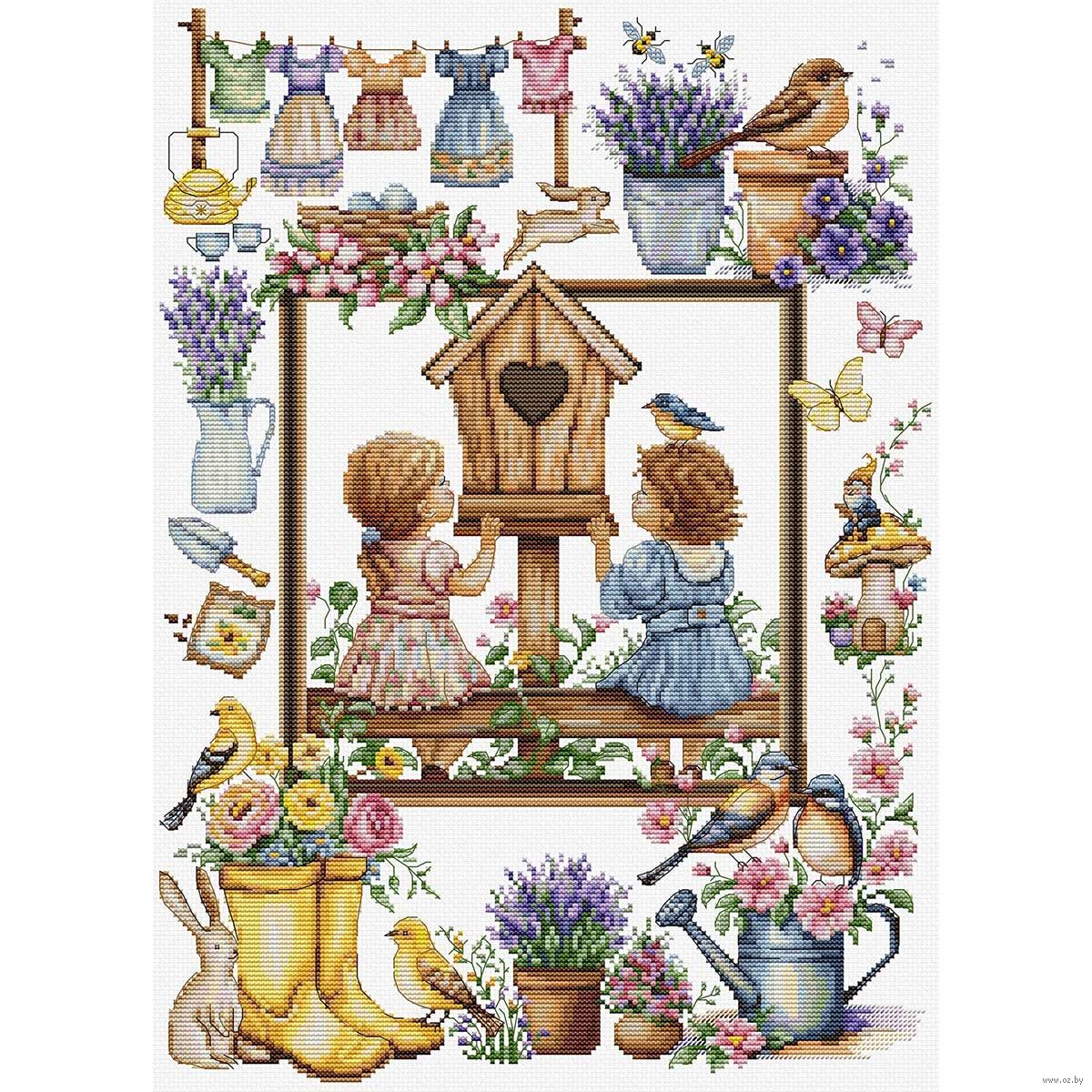 Готовая вышивка крестом с изображением ярких цветов и птичек, цветочных горшков, садовых инструментов, украшений и прочих элементов, напоминающих о заботах и уюте весеннего сада. Эта картина, исполненная в нежных, гармоничных тонах, привнесёт в ваш интерьер уют и спокойствие, напоминая о приятных моментах, связанных с процессом создания.